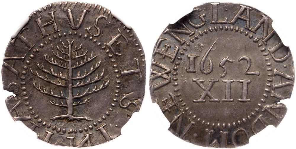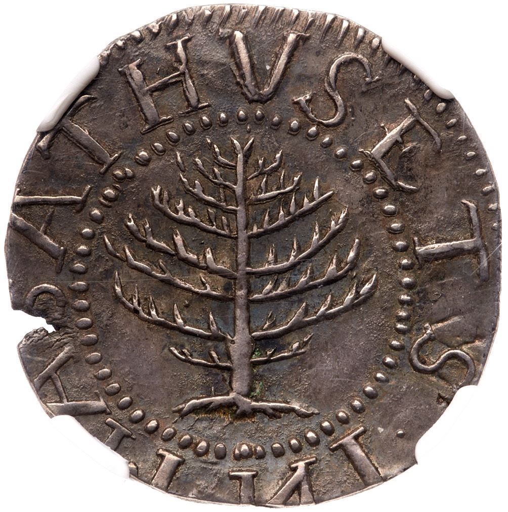 The Large Tree variety. Frosty medium gray with lighter silver on the highpoints. Struck on a large planchet and the only flaw is a fissure at the first S in MASATHVSETS. A beautiful piece with just a hint of friction on the very highest points of the devices. The date and tree are bold and most of the legend is clear. A premium example of this very rare variety, and it comes with a superb provenance. The attribution and Garrett-Salmon Collection provenance are noted on the NGC label. Listed on page 36 in the 2023 "Redbook." Weight 70.2 grains.