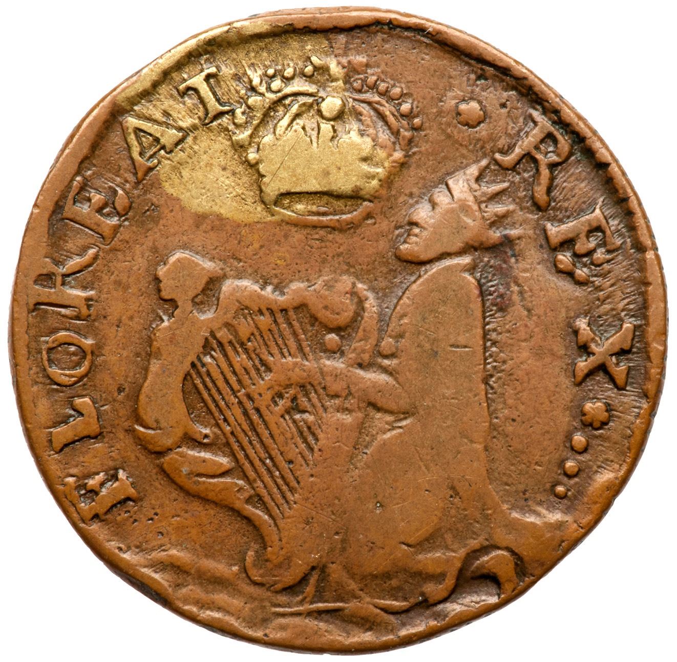 Breen's "Sea Beasts Below King, Stars in Legends" type. Choice glossy light brown with traces of chocolate brown toning in protected areas. The surfaces are smooth and the eye appeal of this piece is excellent. The only notable mark is a small planchet flake in the roof of the church, as struck. The legends are complete and clear except for minor elements of the legend above Saint Patrick that extend slightly off the planchet. The brass splasher is very bright and extends well outside the crown. Another premium Saint Patrick farthing and great mate for the previous lot. Noyes photo #72048. Weight 94.4 grains.