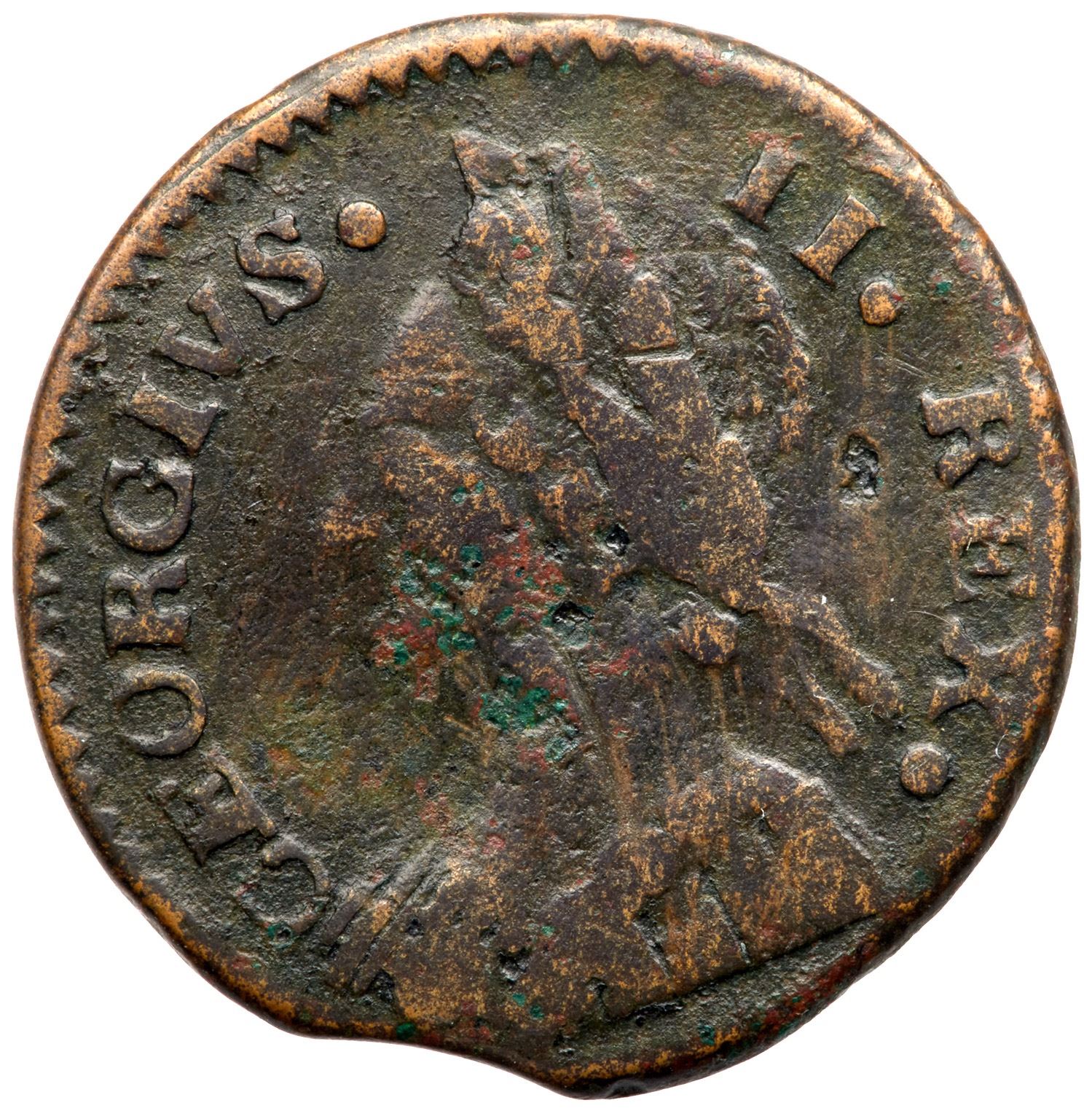 Sharpness VF20 or a bit better but there are small areas of shallow corrosion and verdigris on the obverse and microscopic roughness covering the remainder of the planchet. Rather glossy dark chocolate brown with slightly lighter brown toning on the highpoints. Looks better than it might sound, and the reverse is quite nice. The 17 in the date is weak but the 47 is clear and the legends are strong. A curved planchet clip (as struck) affects the dentils under the date and just touches the tip of the bust on the obverse. Weight 110.1 grains.