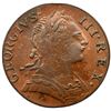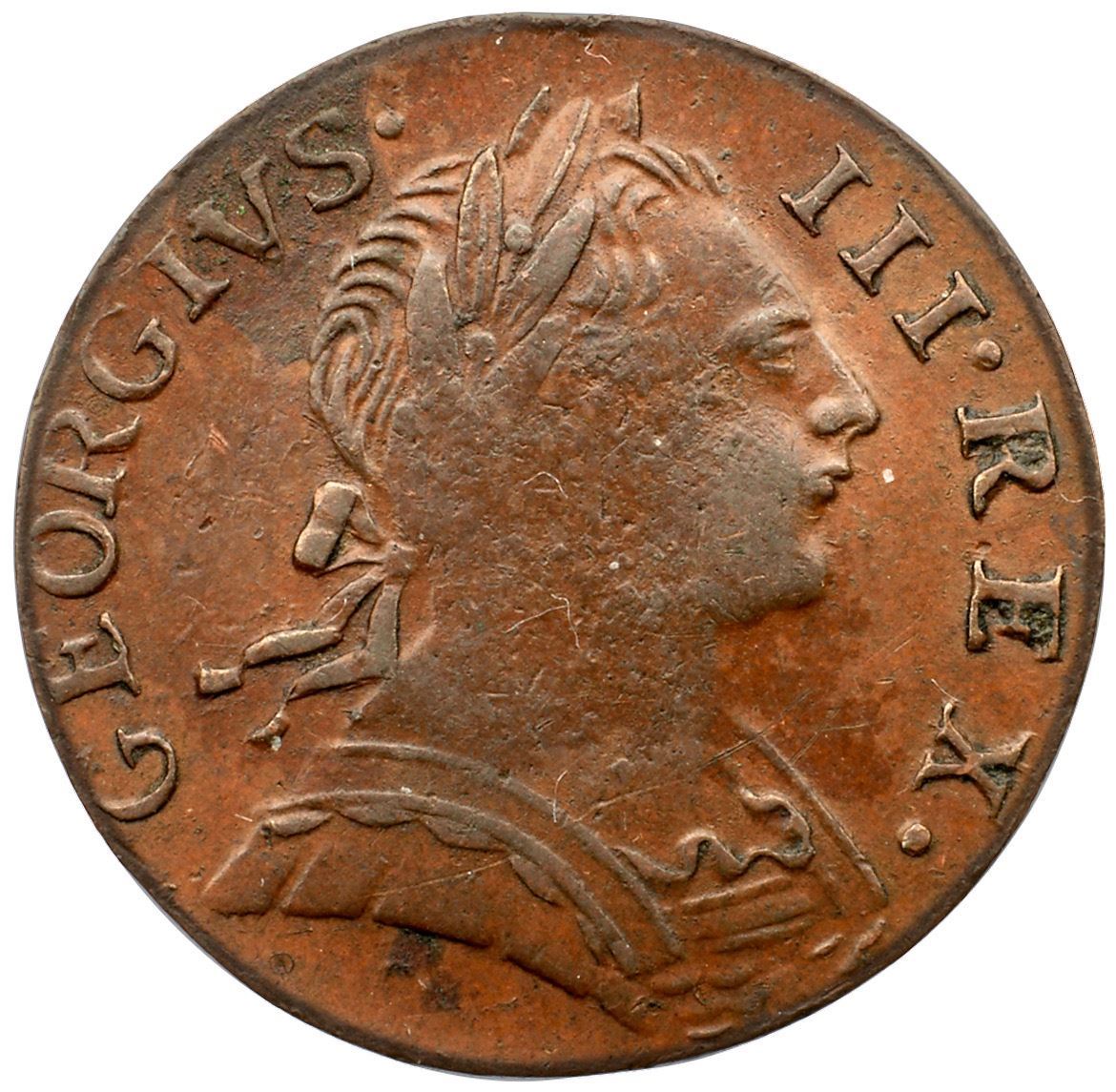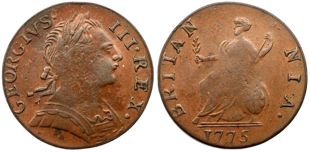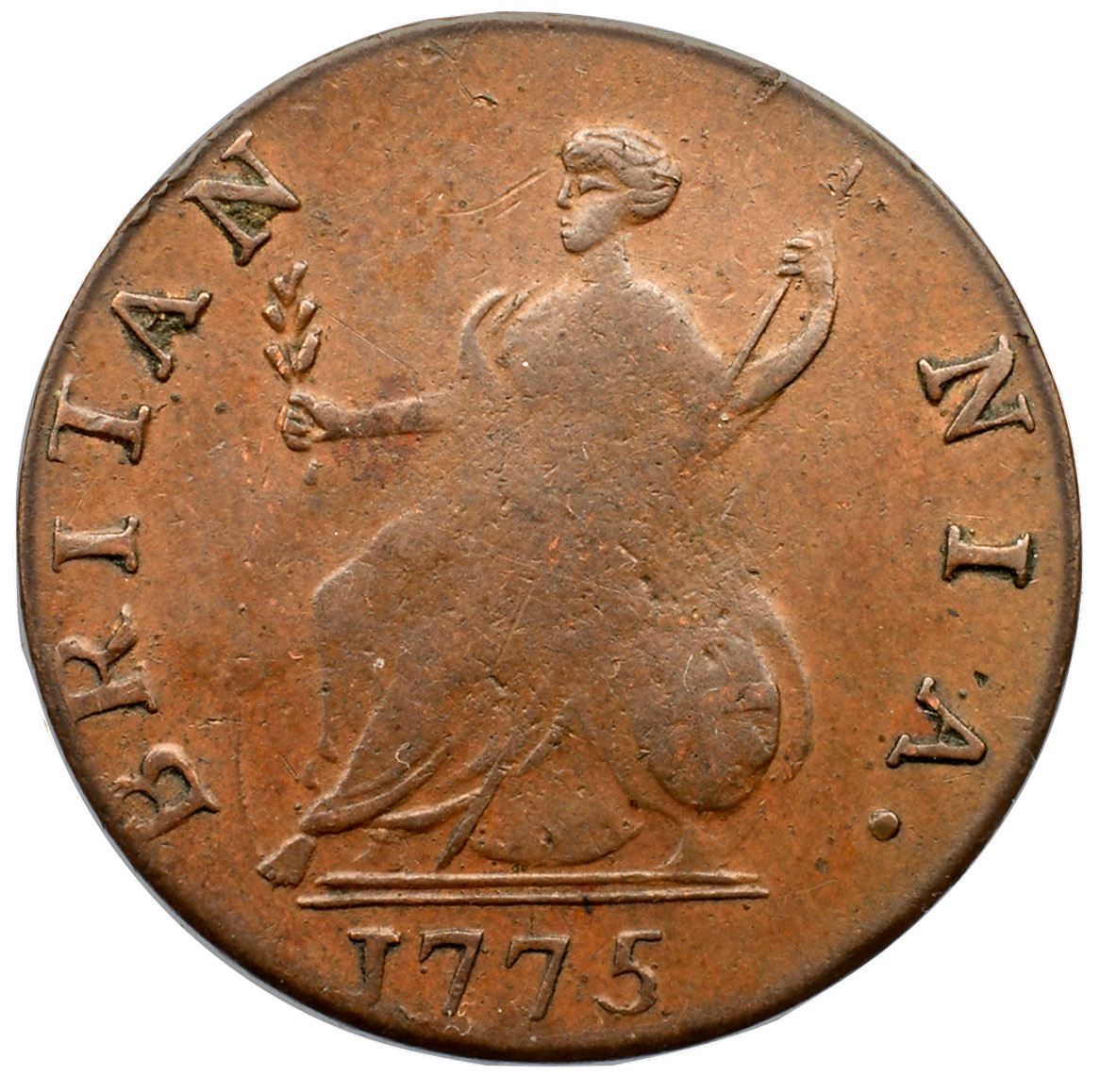 1775 Counterfeit George III British Farthing. 50.8 grains.Extremely Fine, from a family that has not been researched, but is fairly common, sporting large digits in the date, and a branch that looks like a wheat stalk. Well-made, on a good-sized, thick planchet, with good design detail. The legends and date are full, the exact centers a bit weak. Lighter brown, and aside from the weak centers, which show the quality of the blank planchet, the surfaces are hard, and with minimal marks. An attractive counterfeit.