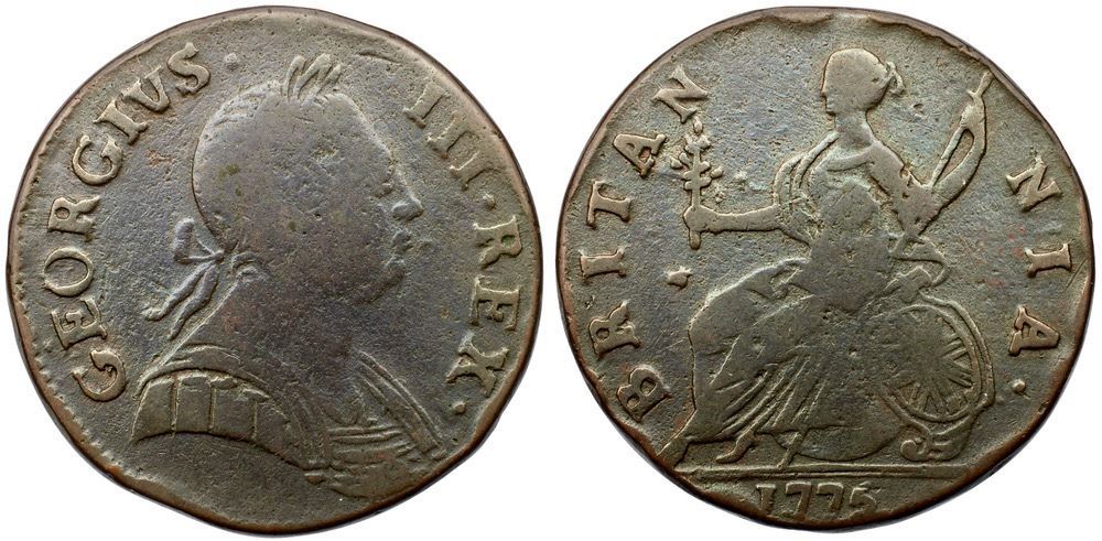 1775 Counterfeit George III British Halfpenny, Georgius Triumpho Family. 128.8 grains.Fine or slightly better, a well-struck example of this large, yet-to-be-published family that will likely be broken into several smaller groups that hold together stylistically, such as the Coin Z Family piece offered above. Full legends and date, the design details as expected for the grade level. Some of the 1775-dated pieces appear to have been from dies that were originally dated 1776, with the engraver removing the lower left part of the loop of the 6 and turning it into a 5, most obvious when the top of the number is diagonal instead of flat, as is the case here; this type of date is called “5 from 6,†and it likely occurred because the maker(s) found out that the Tower Mint had stopped production of British halfpence in 1775, and there were no regal coins dated 1776. Some, but far from all, of the 1776 dated dies were “fixed,†and it may be that this large coinage was produced by several different counterfeiters, some of whom got the word about the date, some of whom did not. The GT Family (for short), is easily distinguishable, as most of the British reverses show berries on the branch, something not found on nearly all other families. Many of the obverse dies also have a V-shaped notch on the obverse bust where the forehead meats the top leaves of the laurel wreath. While not rare, it is an interesting type.