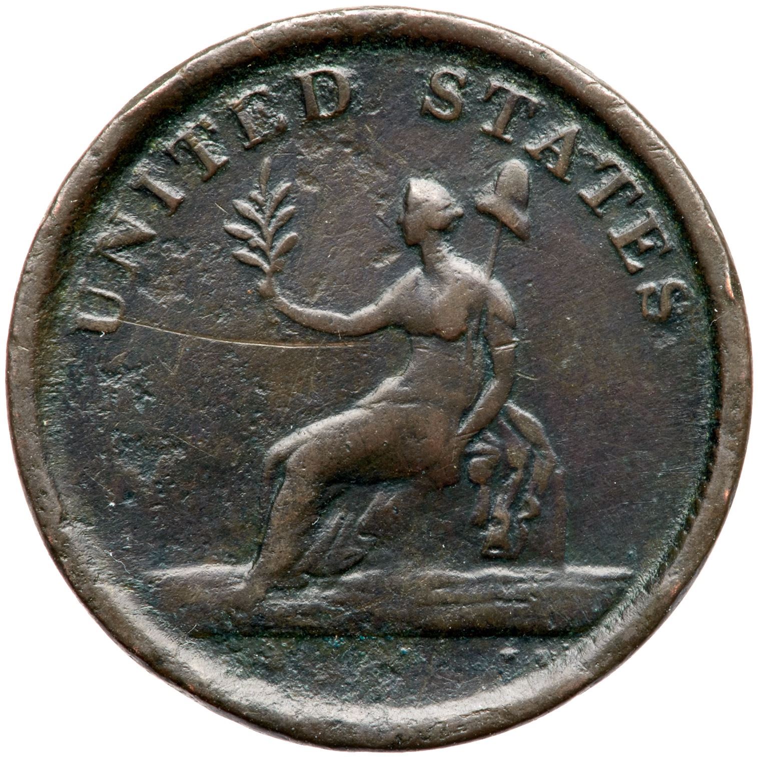 Sharper but covered with microscopic roughness under glossy dark olive brown toning. There are traces of waxy verdigris in protected areas. The only notable mark is a fine scratch from the U to the elbow of the seated figure on the reverse. The date is bold and the legends are clear. Weight 106.2 grains.