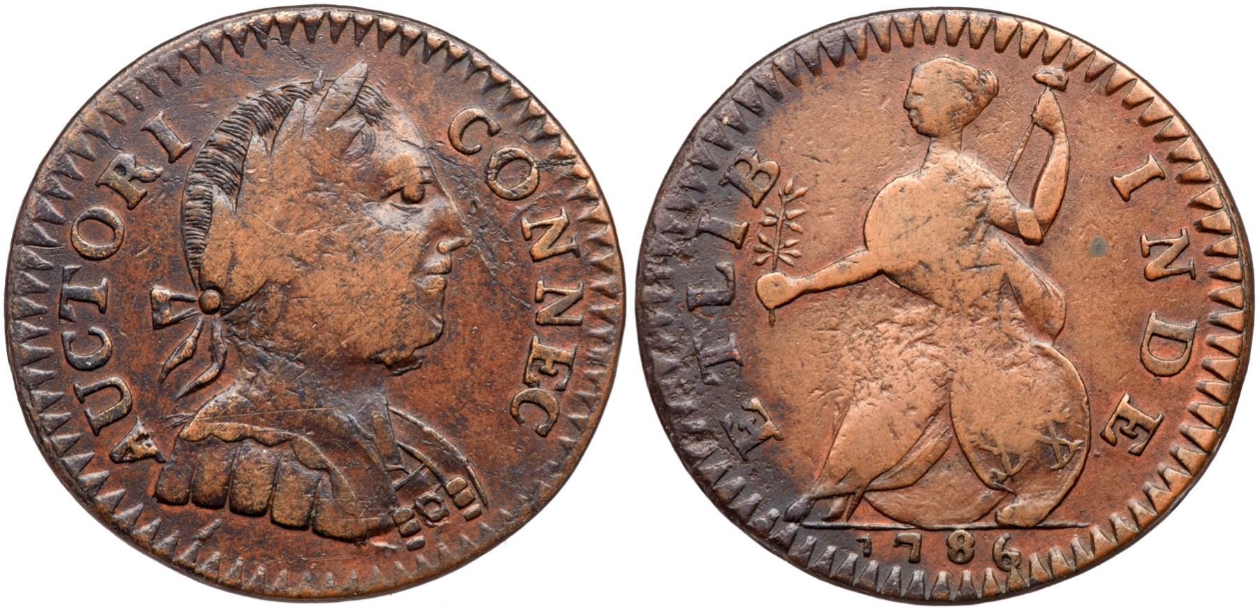 The obverse is glossy chocolate brown with lighter brown and tan toning on the highpoints; the reverse is glossy tan and light brown with an arc of darker chocolate brown toning covering ETLIB. This piece was lightly cleaned and has retoned. There is a thin planchet fissure from the dentils above the head through the forehead into the field below ONN and small chips at the dentils over ETLIB, all as struck. Otherwise the planchet is smooth with surfaces that are clearly superior to most of this variety. Only minor evident weakness in the centers. The date and legends are bold. A premium example of the variety and the ETLIB INDE type in spite of the old cleaning. Weight 135.7 grains.