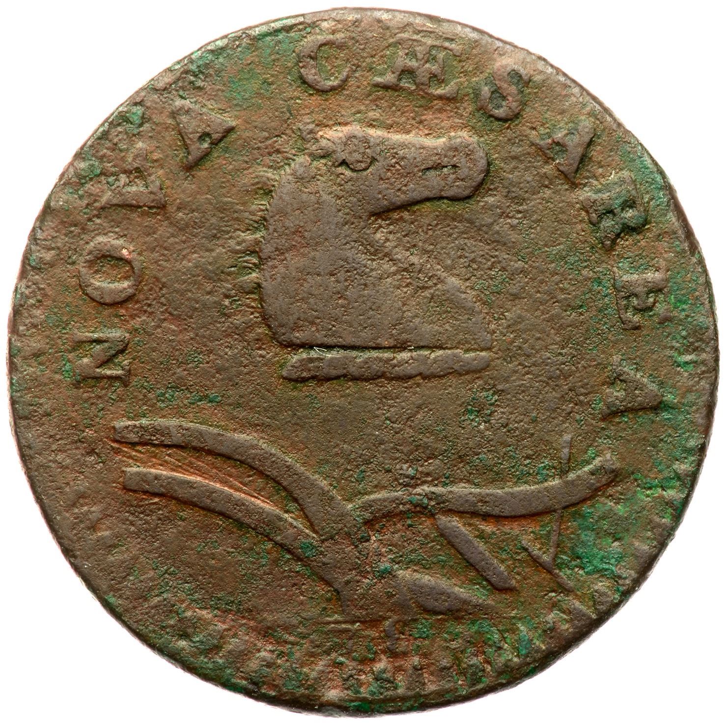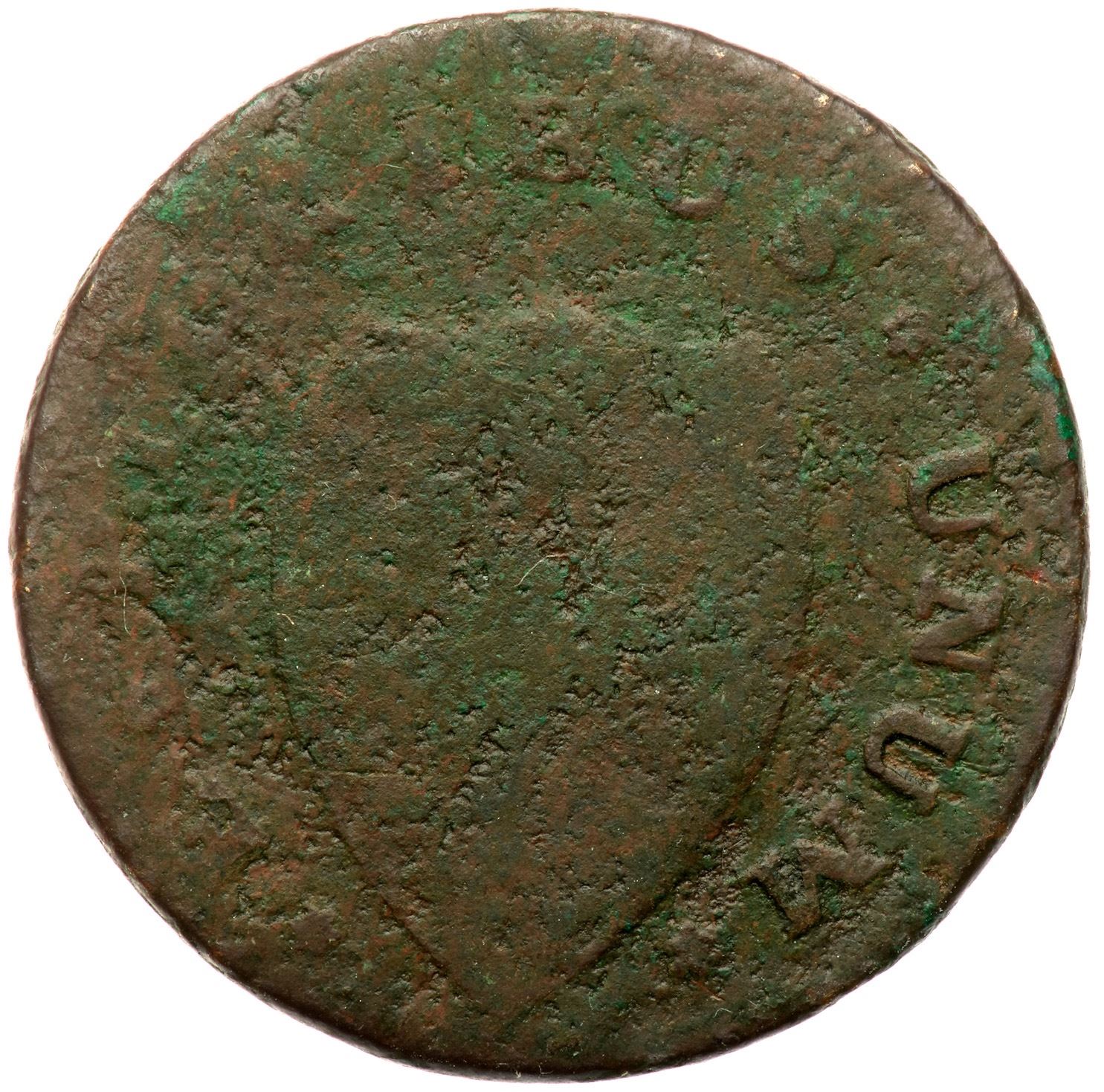 Sharpness F15 but corroded with green verdigris showing , mostly on the reverse. Looks like a copper than was lost in soil for some time. The date is weak due to the corrosion but most of the legends are clear and some of the devices are quite strong. Dark reddish chocolate and steel. Weight 130.2 grains.