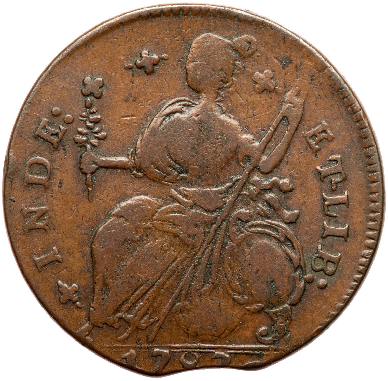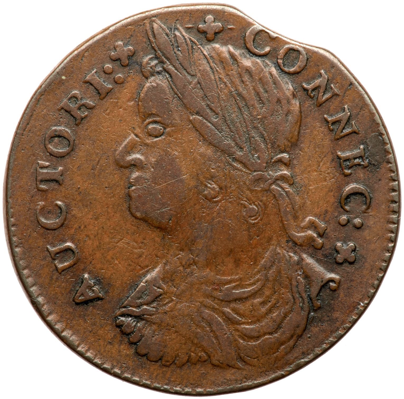 Very attractive glossy medium brown and light chocolate. Smooth and nearly flawless offering great eye appeal. The only marks, and they are trivial, are a small diagonal nick on the nose even with the bottom of the eye and a tiny rim bruise over the D in INDE. A small curved planchet clip affects the top of the first C in CONNEC and the lower part of the 87 in the date. Struck very slightly off center to K-1 leaving the bottom of the 17 tight to the edge of the planchet, but the date is easily readable. A premium example of a tough variety, and it comes with a great provenance. Superior to the Taylor and Perkins examples. Considered second finest by Rothschild. This is the plate coin for the variety in the Miller reference. Weight 149.8 grains.