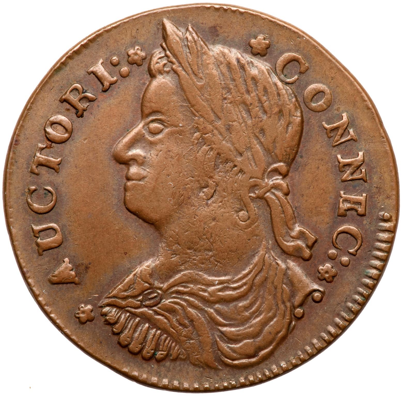 Beautiful glossy medium brown blending to light olive brown in protected areas. The surfaces are smooth, the strike is strong, and this piece has superb eye appeal. Perfectly centered on a flawless planchet with just a touch of wear on the highpoints of the devices. The best struck example known to us and considered the finest by Rothschild. Clearly superior to the Perkins, Ford, and Taylor examples. A premium example of a Connecticut copper. Weight 129.8 grains.
