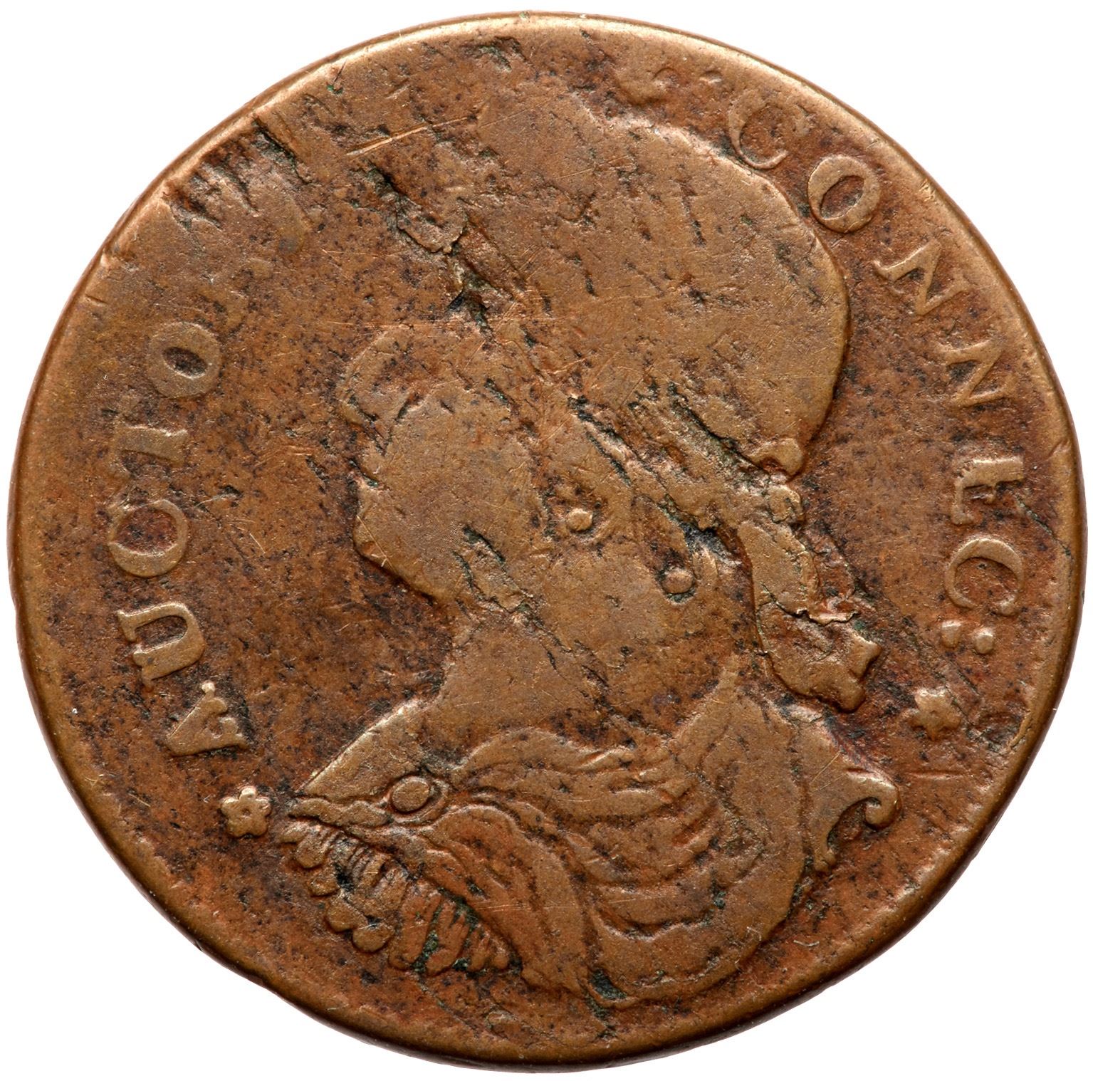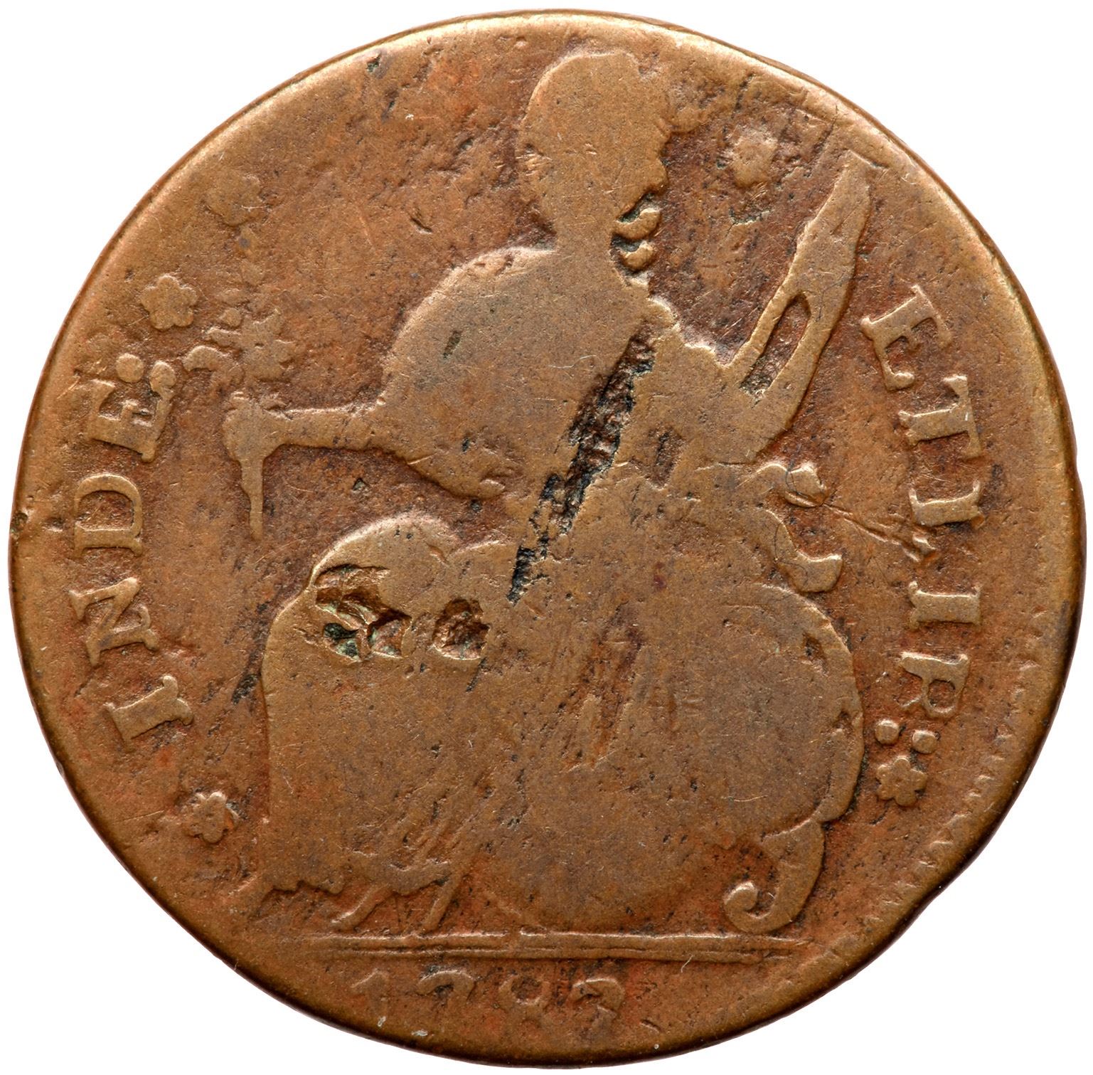 An ET LIR variety. Slightly sharper where properly struck up but there are thin planchet striations covering much of the obverse and a single but more prominent void on Britannia (as struck). The remainder of the planchet is reasonably smooth but there are several obvious digs on Britannia's knees. Mostly glossy medium brown and light chocolate. The bottom edge of the date is off the planchet but it is easily readable and the legends are complete. The ET LIR feature is strong. Weight 131.6 grains.
