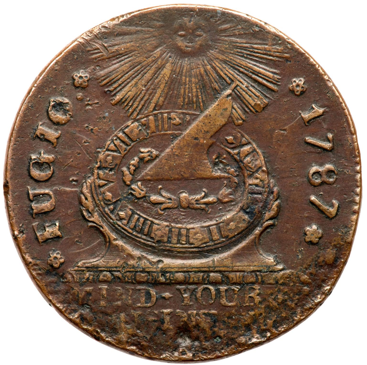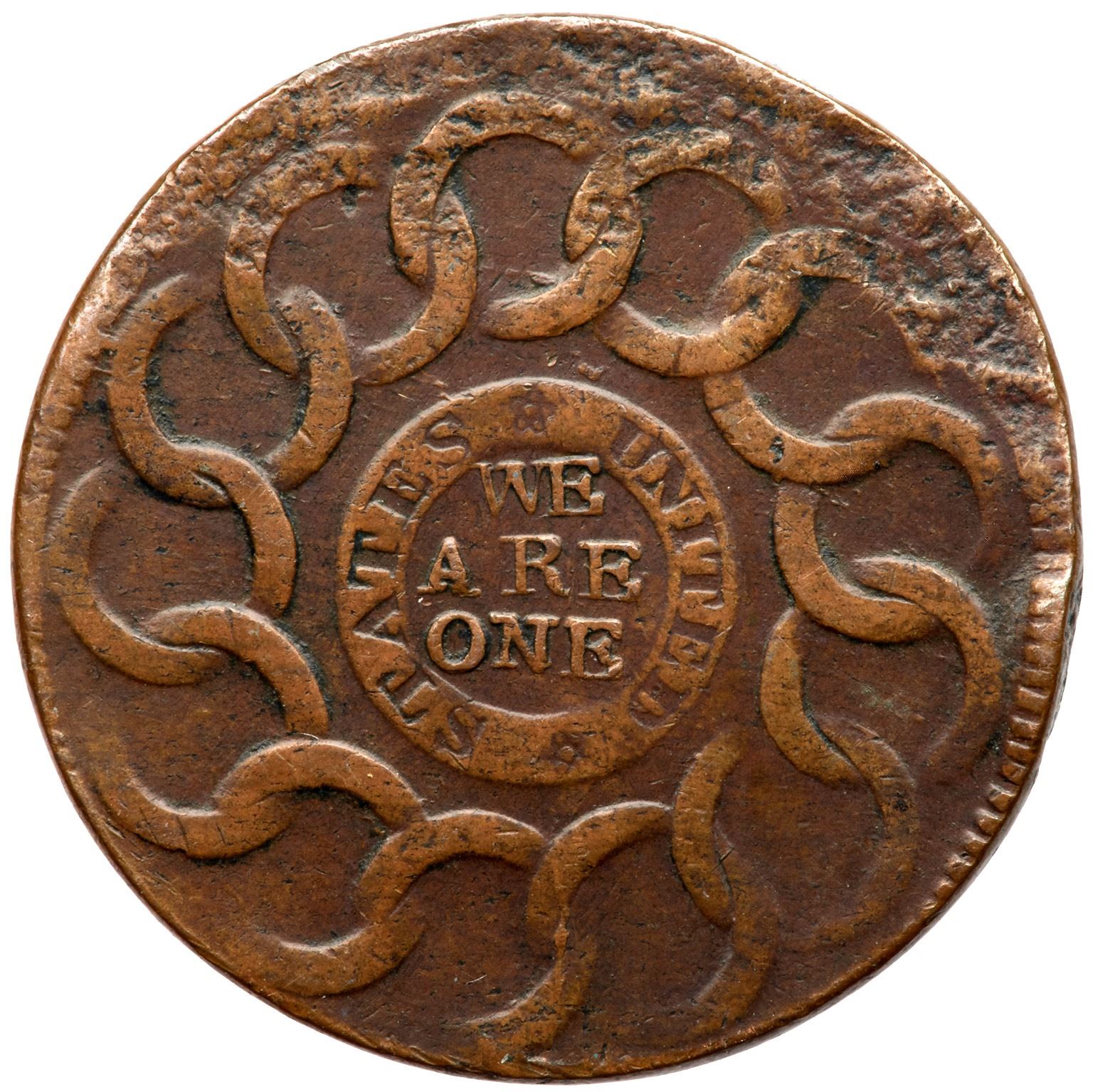 A "STATES UNITED" variety. Sharpness near EF40 but damaged among the lower part of the obverse and upper part of the reverse. Otherwise the surfaces are smooth and the color is an attractive glossy chocolate brown with lighter brown highpoints. The damage is rough flattening and much of BUSINESS is unreadable but everything else is clear.