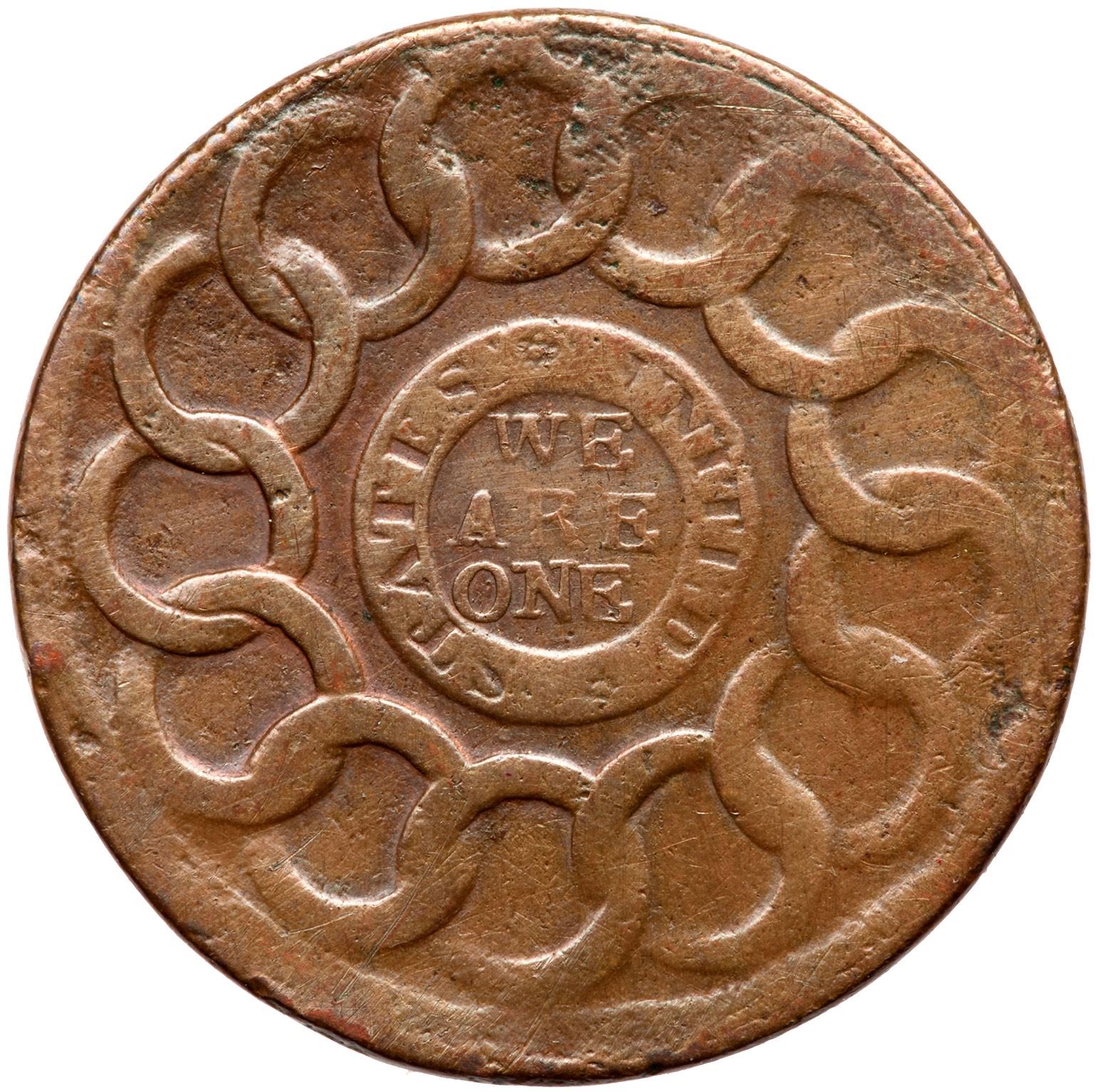 A "STATES UNITED" variety with a Wide Date. Several points sharper but fine porosity covers most of the obverse while the reverse is mostly smooth. No verdigris and the only notable mark is a dull diagonal scratch through the rays on the right side of the sun. The date and legends are complete and easily readable with the exception of the final S in BUSINESS. MDS with fine die clashmarks on the obverse but no clashmarks on the reverse. Weight 157.5 grains.
