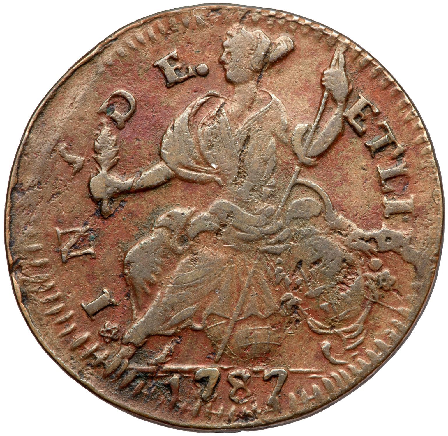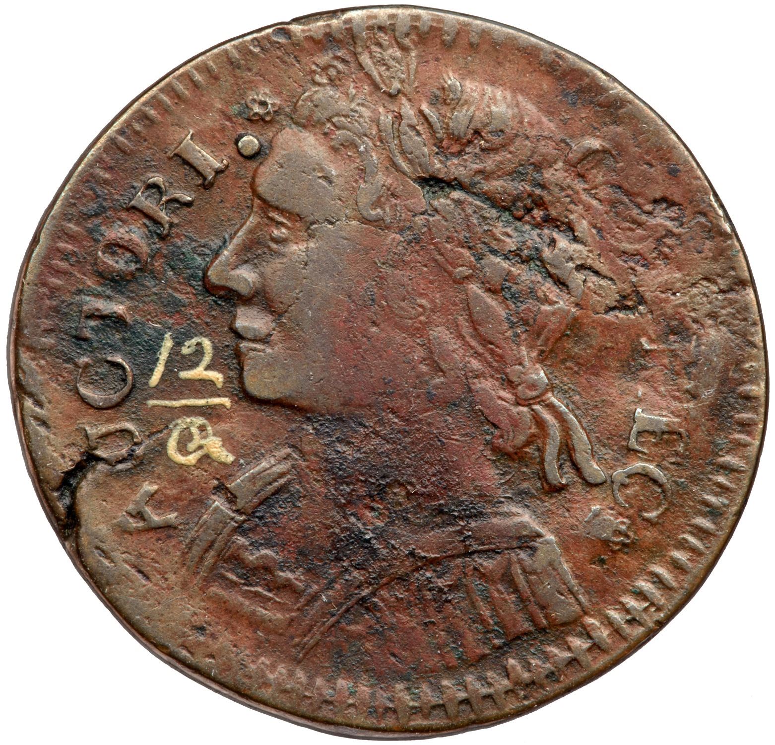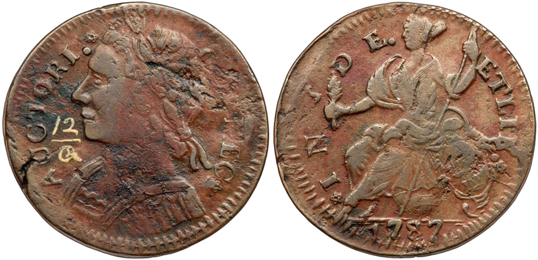 Mostly glossy mix of steel brown, reddish chocolate, and darker olive brown. There are several shallow planchet flakes at the back of the head that obliterate ON in CONNEC and an obvious fissure on the rim at AC in AUCTORI. Patches of shallow verdigris are present on the obverse while the reverse is smooth and nearly flawless. Later die state with a strong die break through the B in LIB with a lighter radial die crack below. The date is bold and the overdate feature is clear. Nearly centered on the planchet. The attribution was neatly added in white ink in the field before the chin. Weight 127.9 grains.