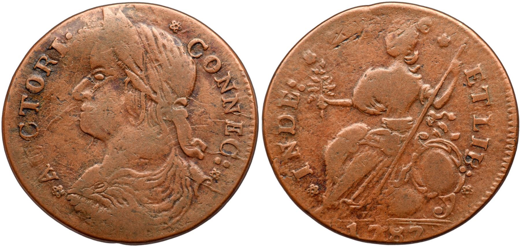 Choice glossy medium brown with some light chocolate brown toning in protected areas. The surfaces are smooth except for a few trivial planchet chips at the top of the reverse. A beautiful piece for the grade. No contact marks or other defects, just lightly worn. The bottom of the date is off the planchet but the rest is strong and the legends are complete (except for strike weakness on the U in AUCTORI). Late die state with strong swelling and many fine die cracks on the obverse. Weight 154.5 grains.