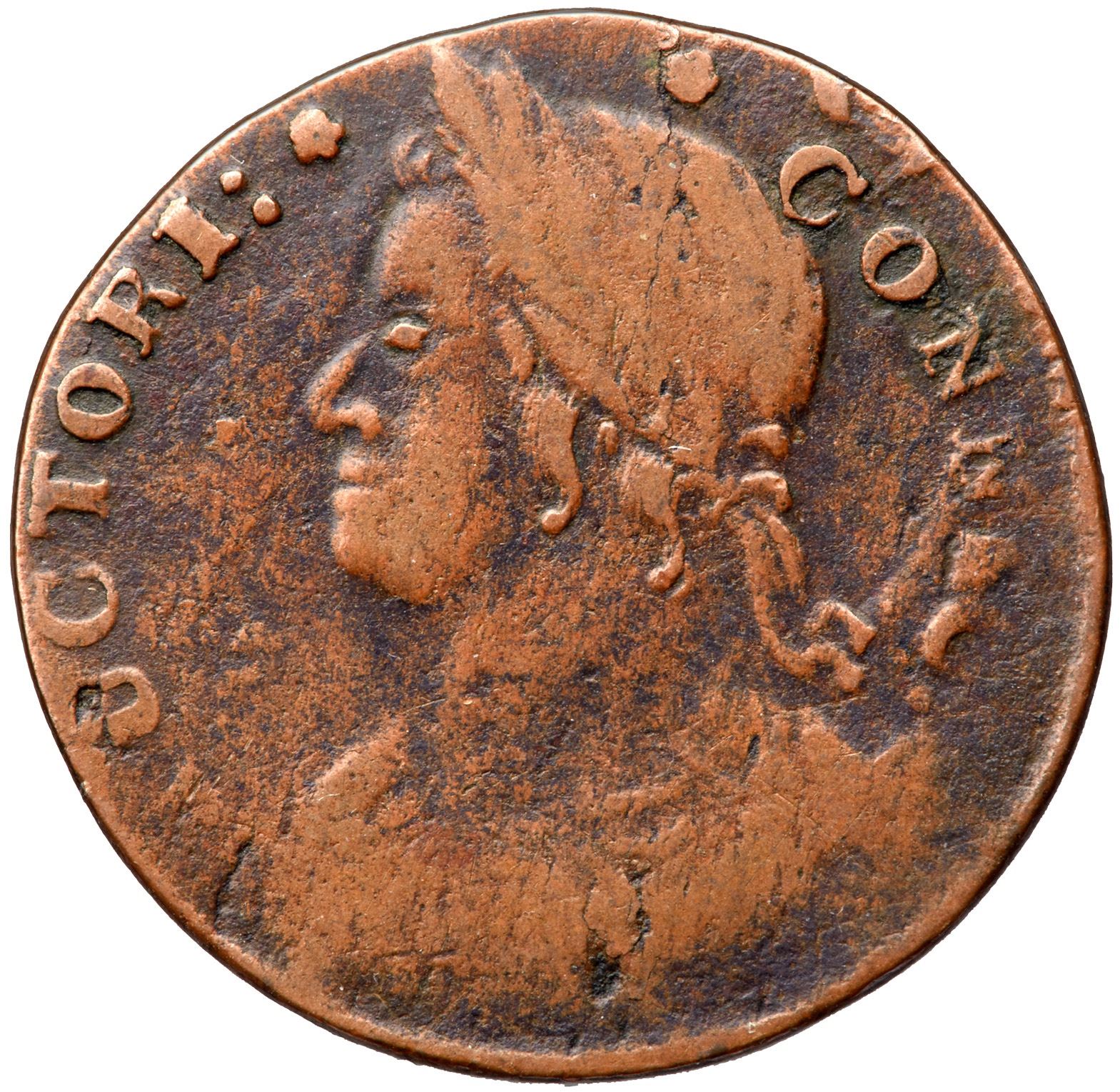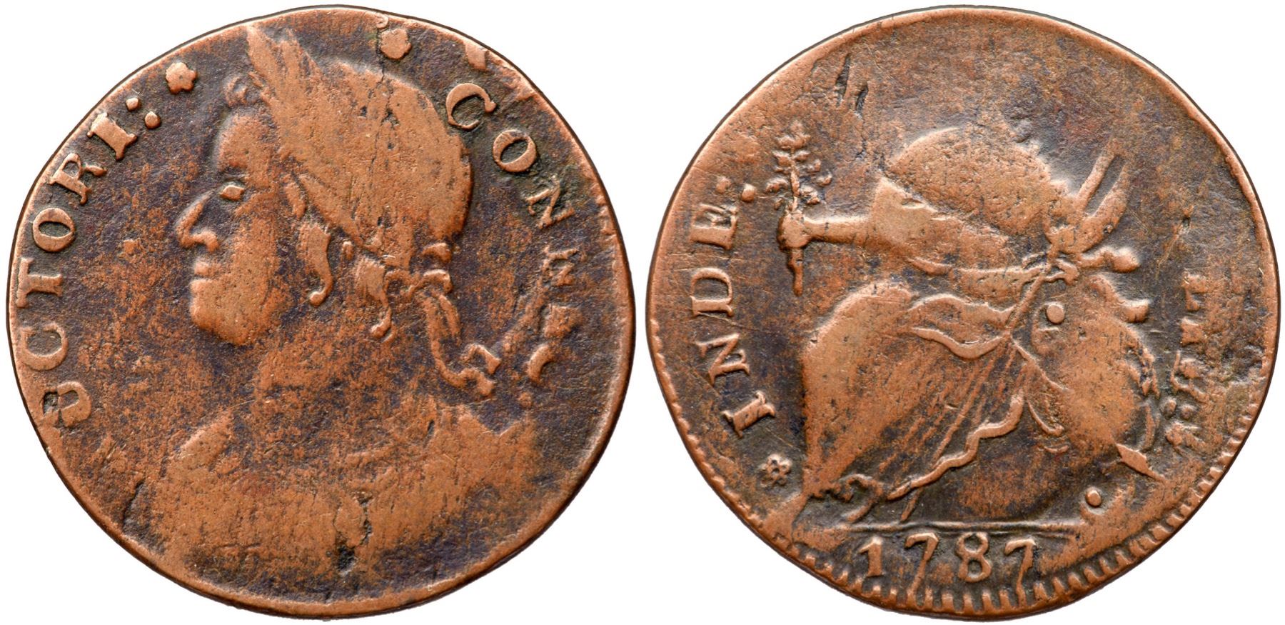 A nice Very Fine where the designs are properly struck up but the lower half of the obverse and upper part of the reverse are weakly struck (your cataloger has never seen a properly struck example of this variety). Rather glossy light to medium brown with medium chocolate brown toning in protected areas. The planchet is covered with microscopic roughness on all but the highpoints, which are smooth. A small flake at the bottom of the bust, another at the top of U in AUCTORI, and a pair of small fissures in the field before the head of the seated figure are the notable planchet defects. A thin, old scratch through ET is the only contact mark. Both dies are swollen, especially the reverse. The date is complete and strong in spite of the swelling in that area and most of the legends are clear. Weight 128.3 grains.