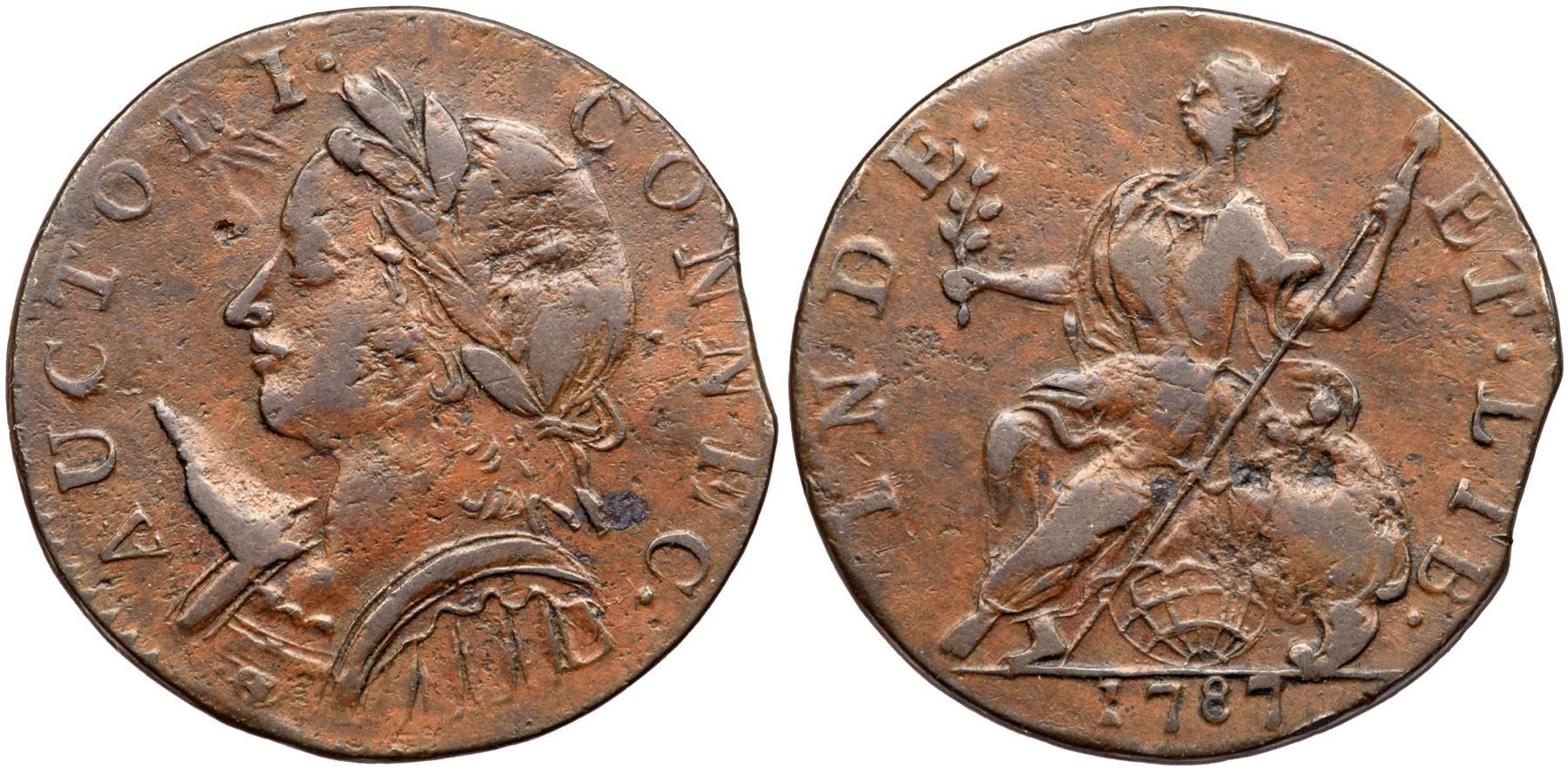 Glossy medium brown and light chocolate with darker steel brown toning on the highpoints. The surfaces are smooth except for a spot of dark planchet slag imbedded into the planchet near the end of the hair ribbon and a small planchet chip in the field before the eye. A curved planchet clip touching the top of NN in CONNEC can help identify this piece. Rare very late die state with a bold "Horn" up from the bust. This break is quite wide, considerably wider than the horn on the preceding example. The die clashmarks at the R in AUCTORI are clear. The date is bold and the legends are strong. This example was plated in the January 1973 issue of the Colonial Newsletter, (Volume 12, number 1, page 385) to illustrate the very late die state. Weight 105.2 grains. Comes with a nice provenance.