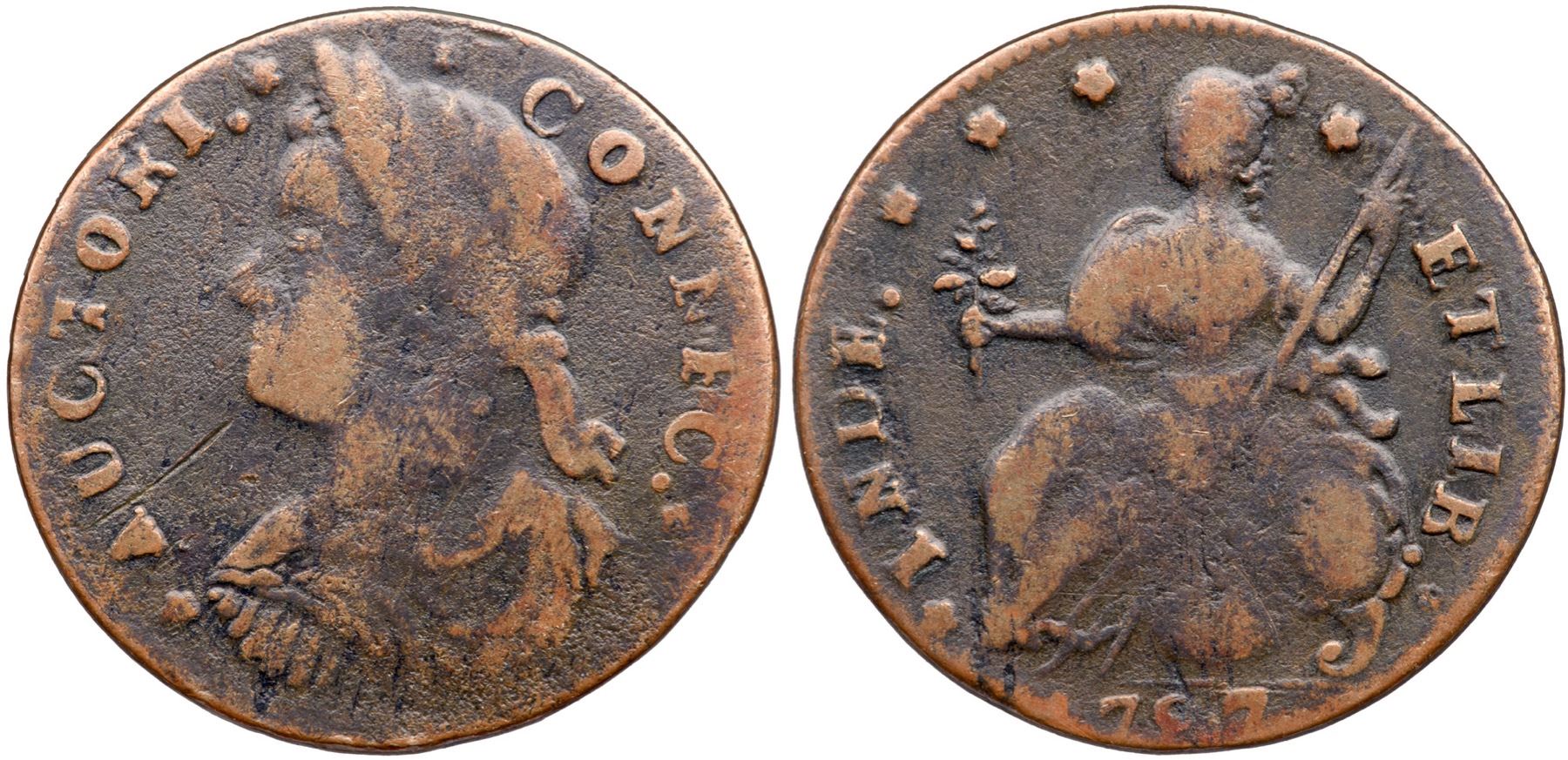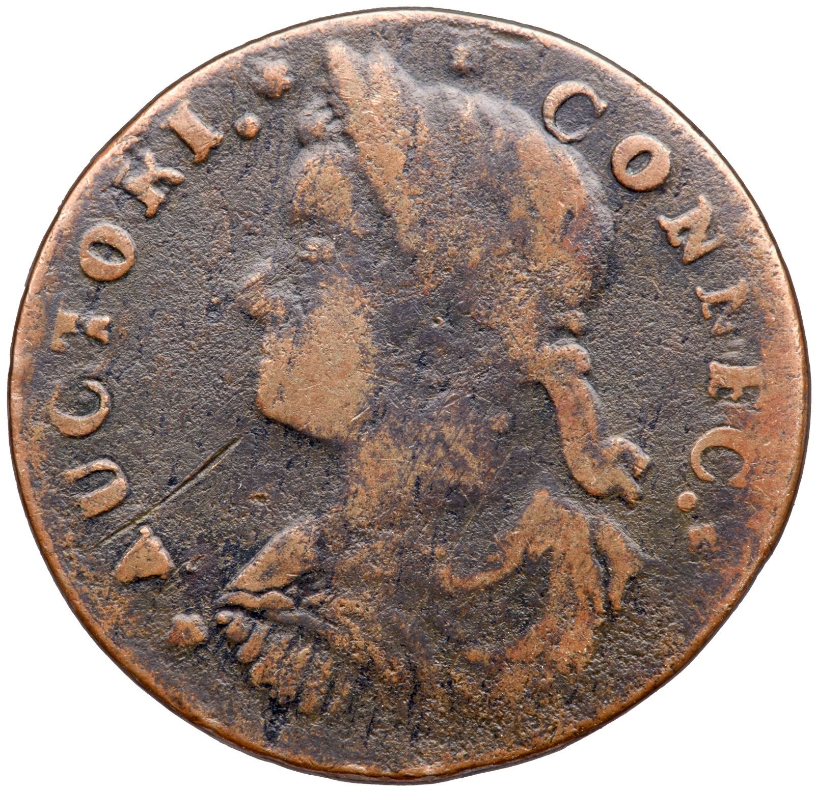 Slightly glossy chocolate brown and steel with lighter brown toning on the highpoints. Covered with fine granularity on all but the highpoints, which are smooth. The notable marks are an old diagonal scratch between AU and the chin and a spot of shallow corrosion between the 8 & 7 in the date. The bottom of the date is off the planchet and the CONNFC error is visible but not strong. Weight 125.9 grains.