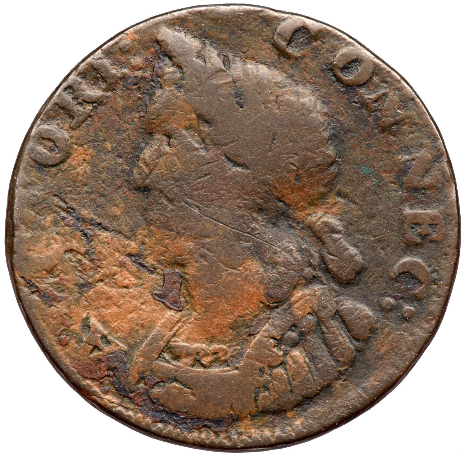 Partly glossy mix of medium olive brown and lighter tan. The fields and protected areas show minor roughness and the surfaces are a bit uneven. Planchet striations before the neck have weakened AUCT but the remainder of the legends are easily readable (although the top of a few letters are off the planchet). Only traces of the date remain visible as most of it is off the planchet (as usual for this variety). The only notable contact mark is a fine diagonal scratch high on the neck. Struck with the reverse rotated 90 degrees clockwise, as usual for this die pairing. An acceptable example of the popular "Hercules Head" variety that is highlighted in the "Redbook." Weight 139.4 grains.