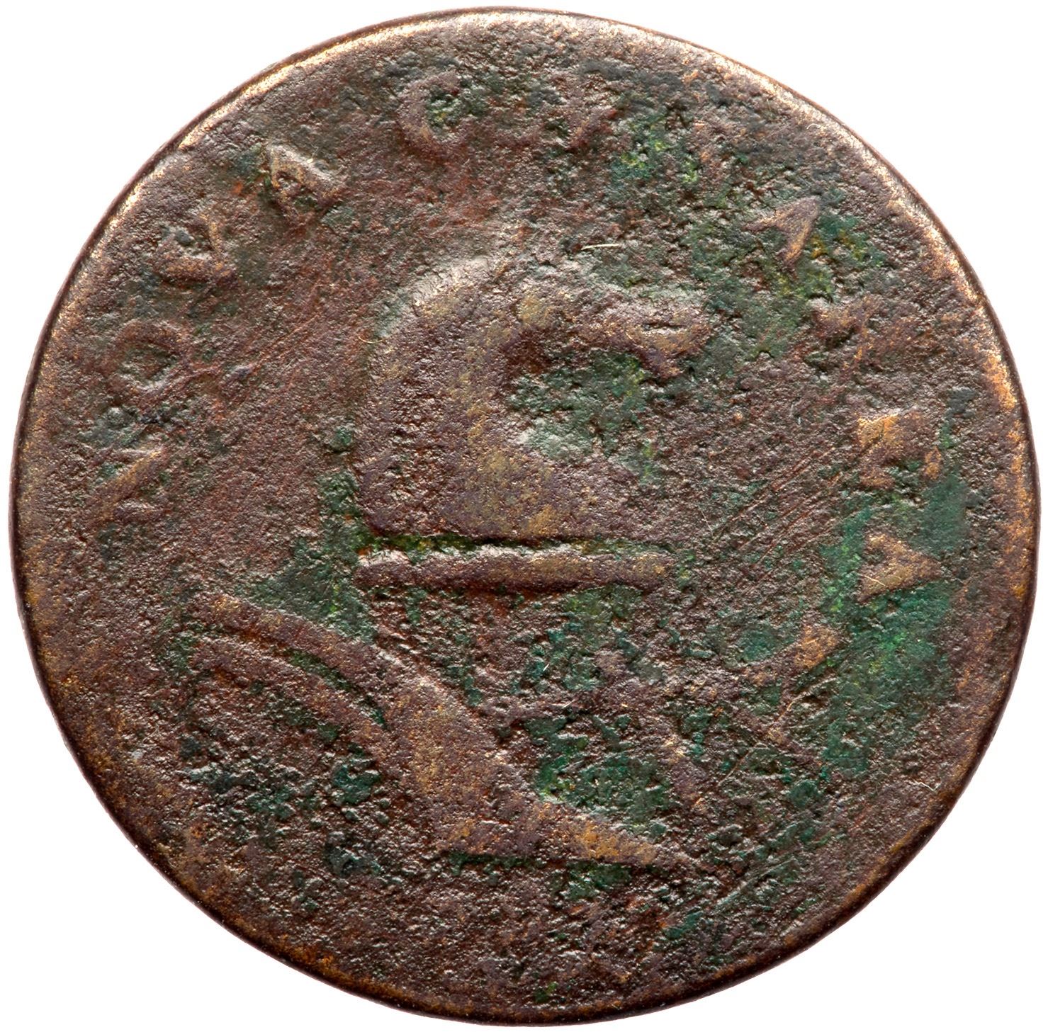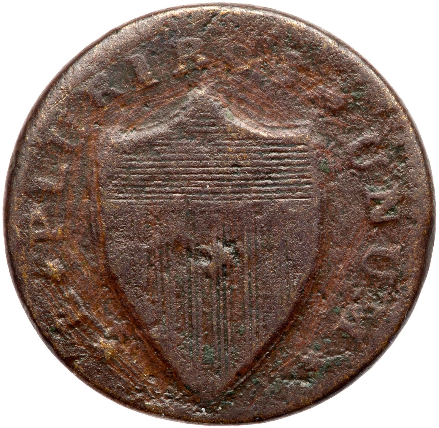Sharpness F15 or better but moderately corroded with shallow greenish verdigris in many of the protected areas. The only notable marks are some very old scratches through the legend outside the shield. Dark reddish chocolate and greenish olive. The date is unreadable but the legends are complete (although a couple letters are weak thanks to the roughness). Weight 140.8 grains.