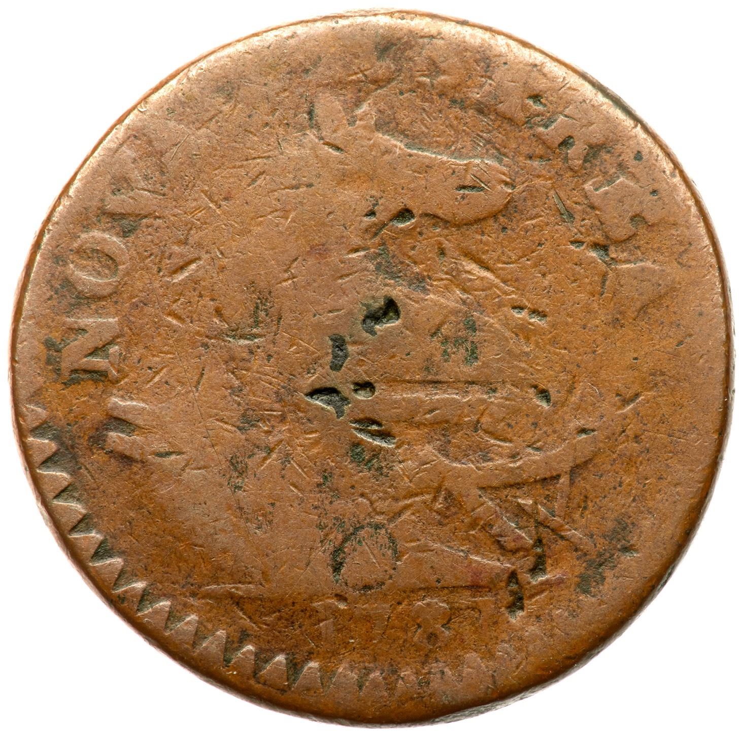 Glossy medium brown and light chocolate. The surfaces are smooth except for a half dozen rather deep planchet chips on both sides, mostly in the centers, and these small chips contain dark planchet slag. No notable contact marks. Struck slightly off center to the top (bottom on the reverse side) leaving some elements slightly off the planchet. The date is complete and easily readable but not strong. Late die state with significant swelling on the left side of the obverse, and the swelling was strong enough to obliterate some of the devices. A rare die state of a very tough variety. Weight 148.2 grains.