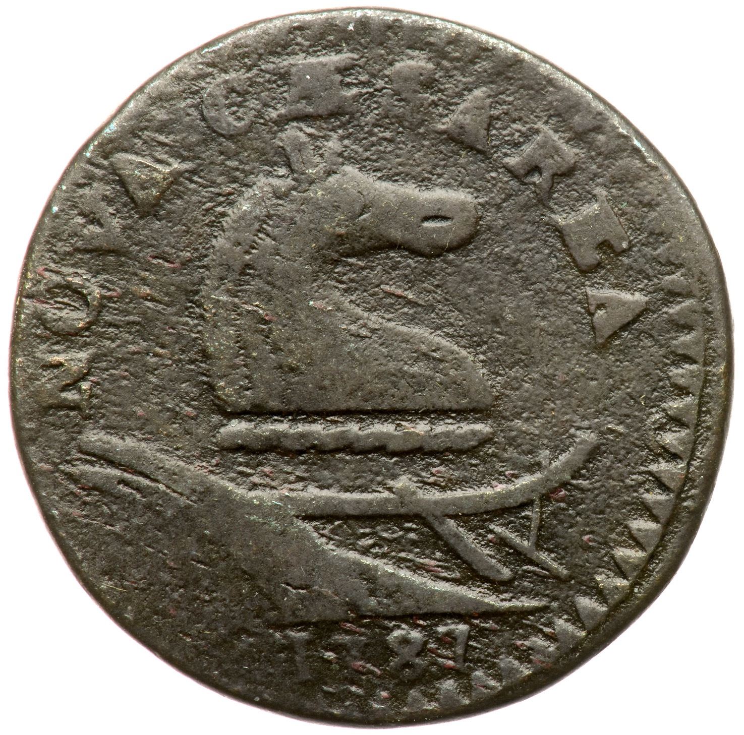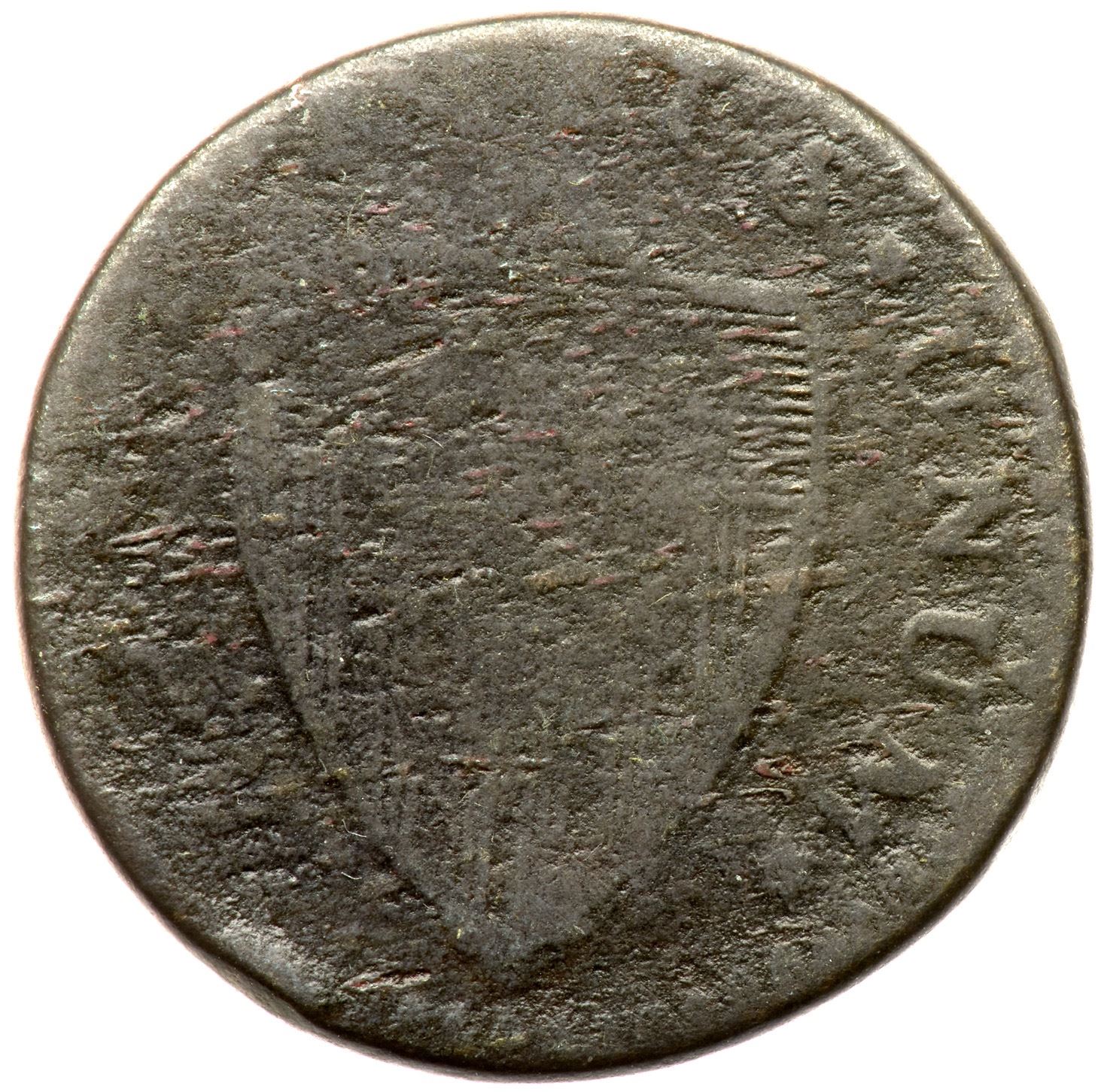 The obverse is considerably sharper than the reverse, perhaps a 15/5 split, and the planchet is dark and granular. No verdigris, and the only notable mark is a very light rim bruise left of the bottom of the shield. Slightly glossy very dark steel and olive brown. Later die state with swelling below the plow handles and the usual weakness at the opposing area at the left top of the reverse. Struck a bit off center to K-10. The date is complete and easily readable. Weight 138.4 grains.
