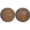 A sharp piece with bold details and a full eye on the horse, but the surfaces are covered with small planchet fissures. There is some shallow reddish corrosion at the end of the plow handles but no other marks. Slightly glossy medium brown blending to darker chocolate near the rims on the reverse. Our grade is net VF25. The attribution is noted on the PCGS Gold Shield label.