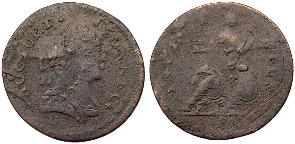 Sharper but dark and lightly corroded. No verdigris and the only notable marks are some old scratches hidden in the patina under the globe on the reverse. Slightly glossy very dark olive brown and steel, nearly black. Double struck over a NOVA CONSTELLATIO copper. The offset between the strikes is significant with one impression about 40% off center and the other centered on the planchet. Bold evidence of the two strikes is visible on both sides. Late die state with a bold die crack at the back of the head. The 178 is clear but the second 8 is faint at best. Most of the legends are clear on the centered strike. Comes with a nice provenance. Weight 103.4 grains.