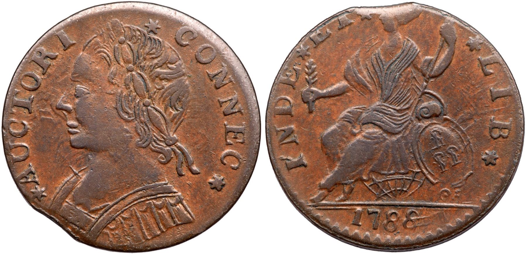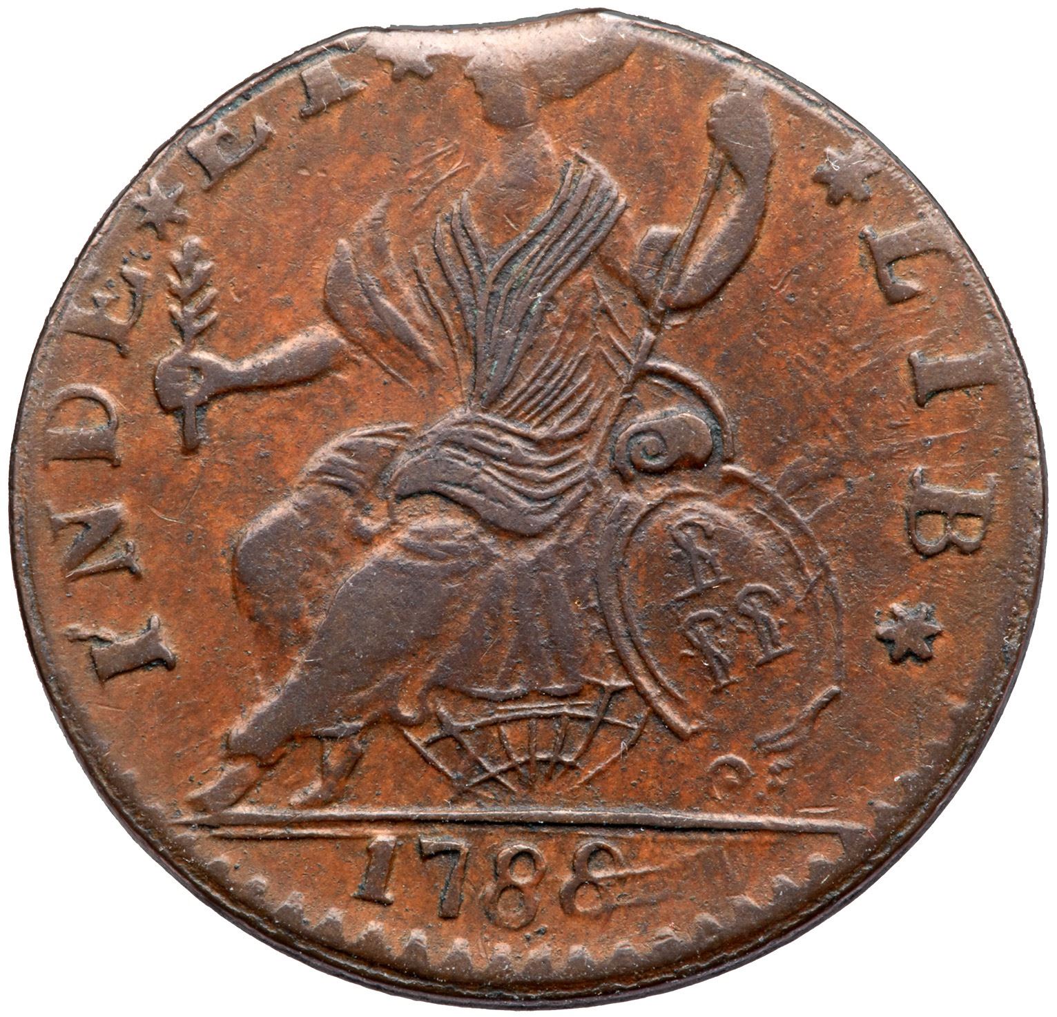 Choice frosty medium brown and light chocolate with tan in protected areas. Smooth and essentially flawless except for a small planchet clip at the bust. The top of the head of the seated figure is lost to the clip. Fairly well centered on the planchet with the top of a few letters off the planchet but everything else complete and strong. Later die state with die clashmarks on both sides. Weight 119.8 grains.