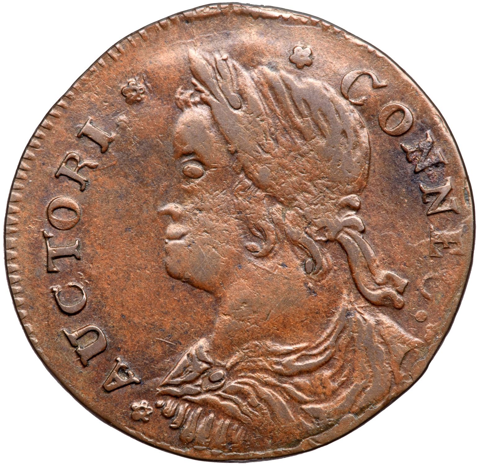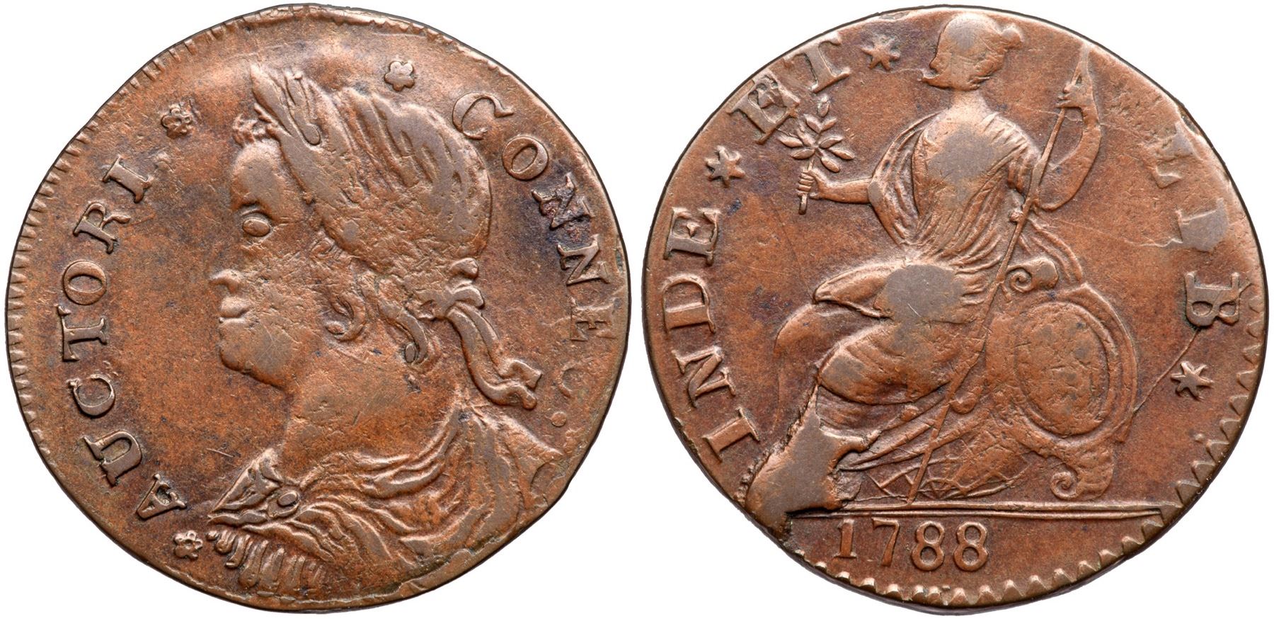 Very attractive frosty light chocolate brown. There is a bit of fine chipping at the cheek of the portrait and at the shield on the reverse, but overall the surfaces are really nice on this piece. Might deserve a slightly higher grade but there is a spot of light corrosion on the first N in CONNEC. Late die state with obvious swelling at the top of the obverse and a massive cud break at the feet of the seated figure. Several fine die cracks also show on the reverse and the I in LIB is swollen and distorted by a small cud break. A beautiful example of a neat die state. Weight 121.4 grains.