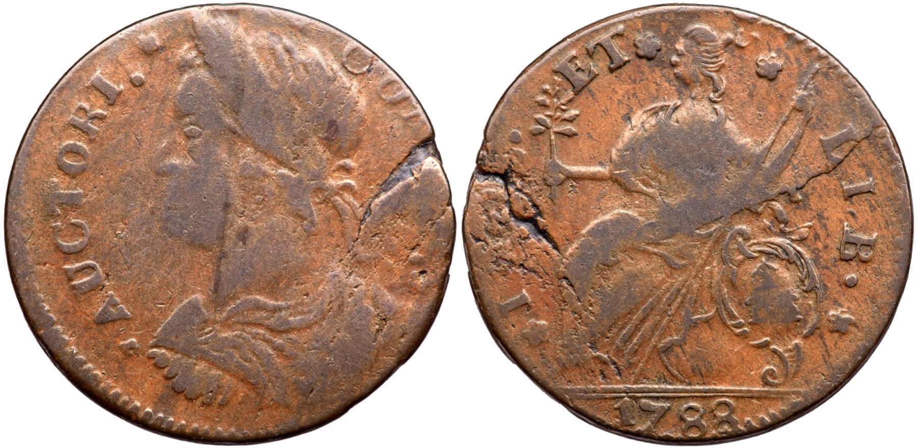 Mostly glossy light to medium brown with darker steel brown toning on the highpoints. Smooth except for a significant planchet fissure at K-3 on the obverse through to K-9 on the reverse. The obverse is misaligned to K-2 leaving most of CONNEC off the planchet. The bottom of the date is slightly off the planchet but the rest is strong. Late die state with swelling at the shoulder and a very strong die crack from the knee to the L in LIB. Struck in medal alignment, head-to-head. Weight 111.1 grains.
