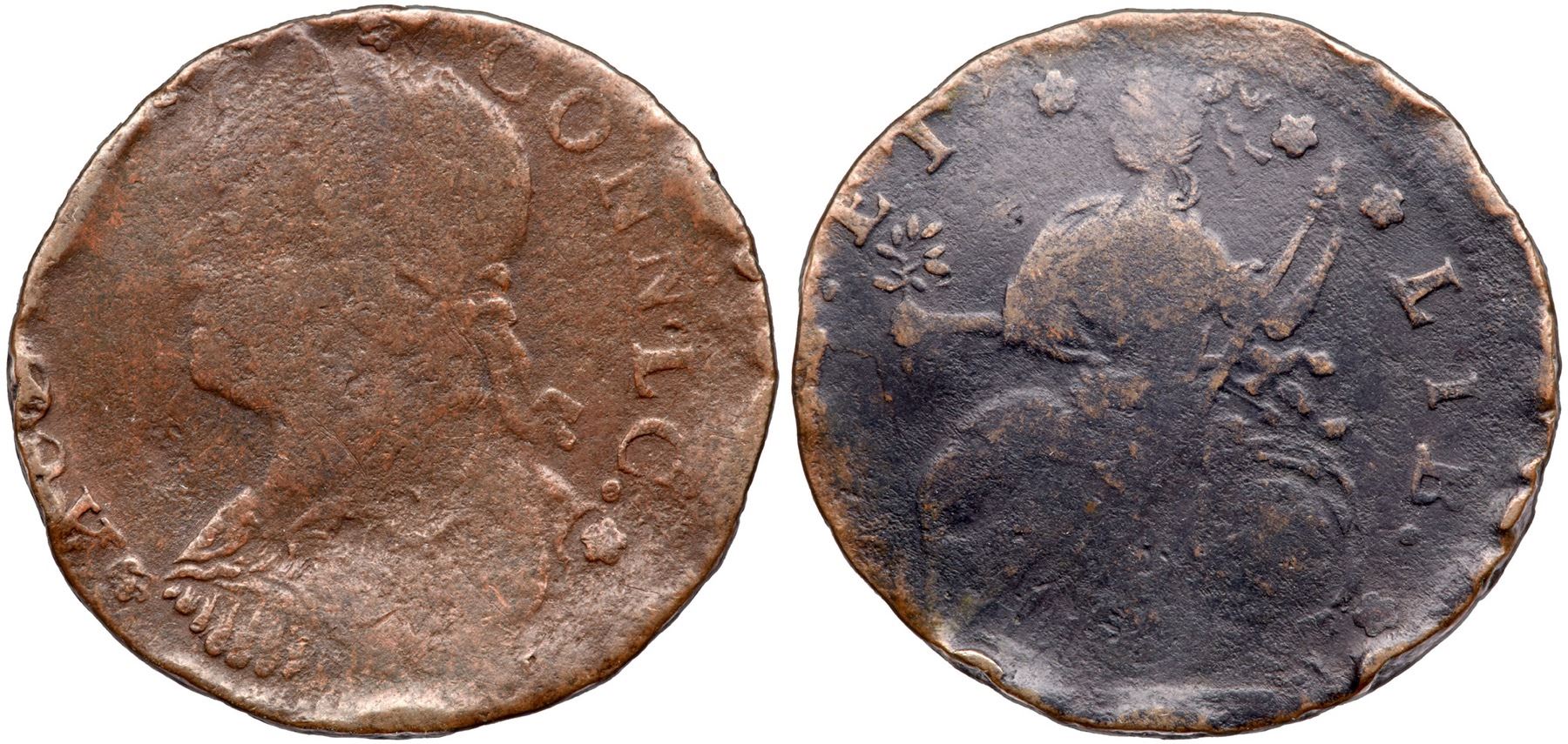 Sharper by several points but there are numerous rim dents around both sides, and some of these marks impinge on the legends and other devices. Slightly glossy light chocolate and steel on the obverse; darker chocolate brown on the reverse. Struck off center to K-10.5. The CONNLC error is complete and clear but the date is off the planchet. Later die state with a die crack creating a slightly sunken retained cud break off the legs of the seated figure. Weight 122.4 grains.