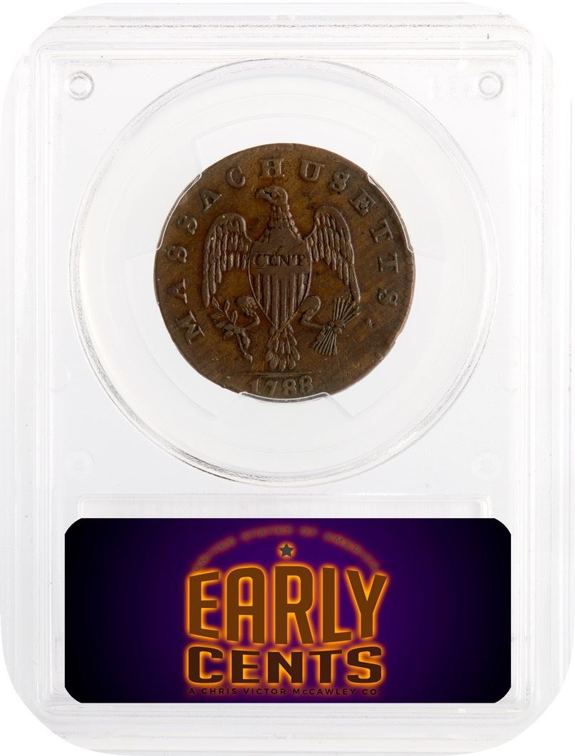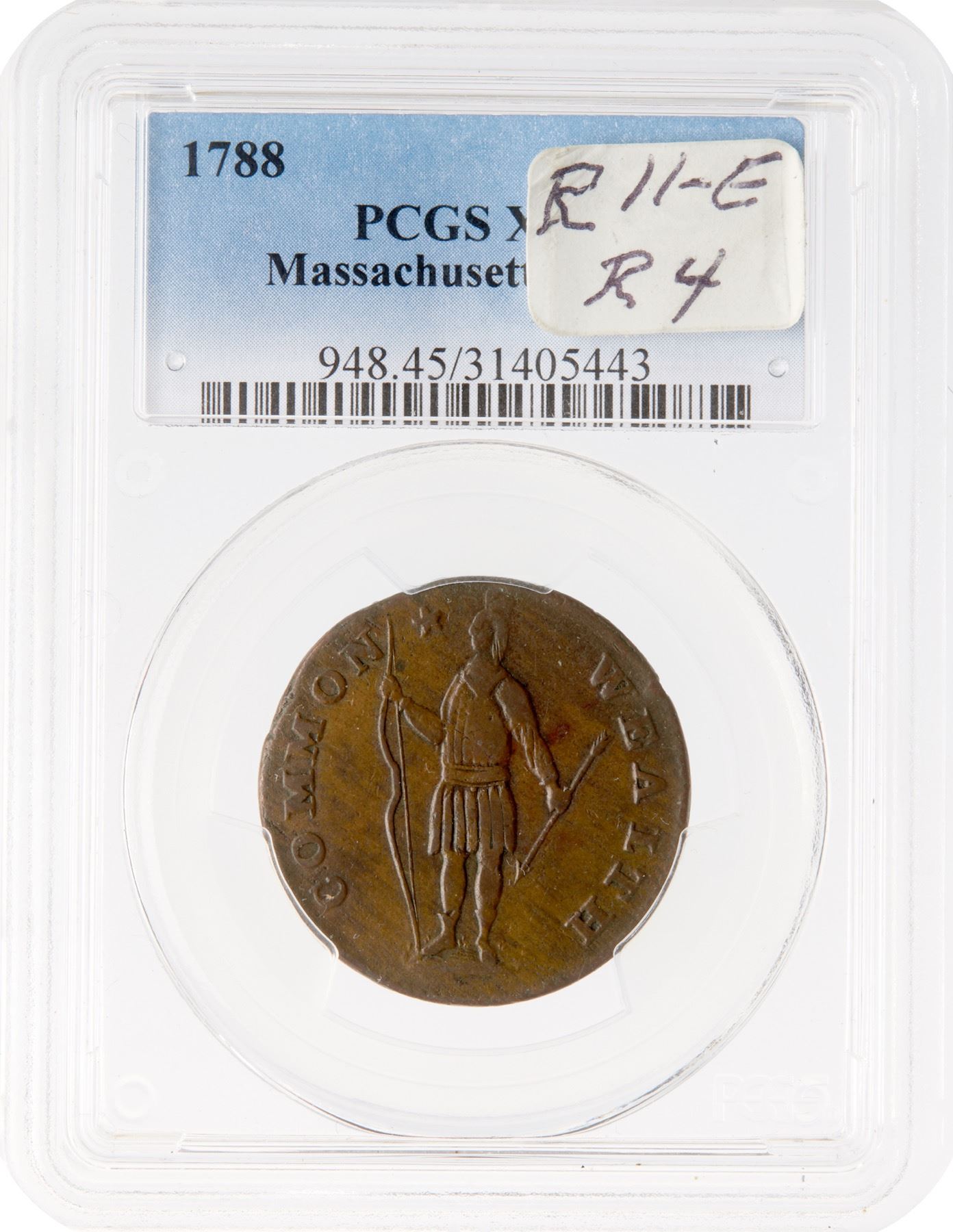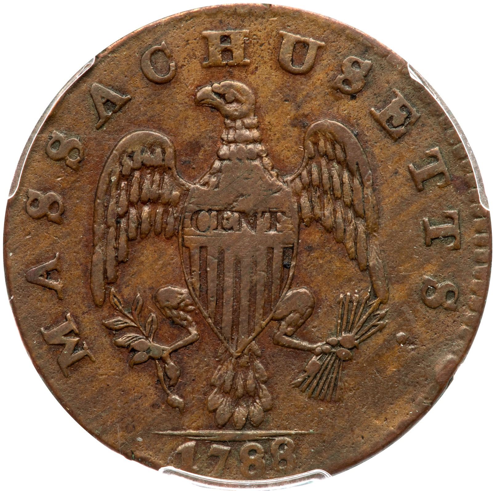 A "Slim Indian" variety with a period following MASSACHUSETTS. Choice glossy mix of medium brown and light chocolate. Smooth and quite attractive, nearly flawless. No spots or stains, and the only planchet flaw is a barely visible fissure on the rim at MO in COMMON. The only marks are a small, dull rim nick at WE in WEALTH and a pinprick in the field right of the arrows. Nicely struck. The date and legends are complete and strong. Our grade is VF35+, close to EF40.