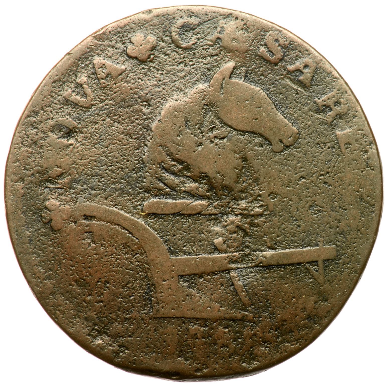 Several points sharper but dented. The dents were strong enough to create bulges in the slightly rough planchet. Fortunately the toning is an attractive and slightly glossy light to medium chocolate brown. The date is weak but the 178 is visible. The legends are nearly complete, including the "Running Fox" feature. An earlier die state, before the significant die failures that are associated with the old Maris 78-dd variety. Weight 139.1 grains.