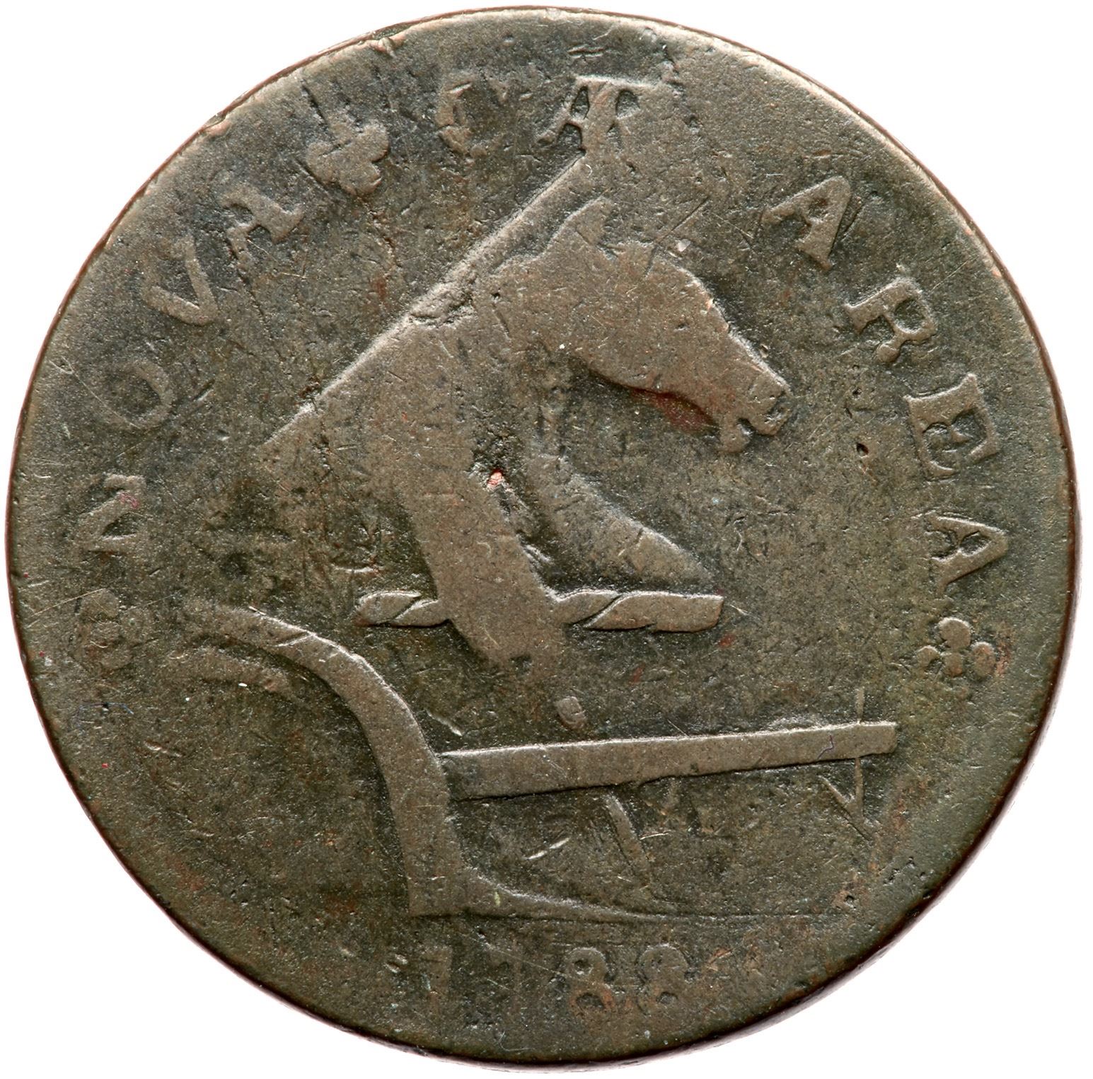 Glossy light olive and steel brown. The surfaces are smooth and the only notable marks are a tiny pit on the neck of the horse and a few thin planchet fissures behind the horse's head. The die state of this piece is very late and many of the devices are badly distorted due to die damage. In addition this piece was struck twice. The offset between impressions was small but the evidence is clearly visible on both sides, clearest at UNUM. The date and legends are easily readable and the "Running Fox" is clear. Weight 152.0 grains.