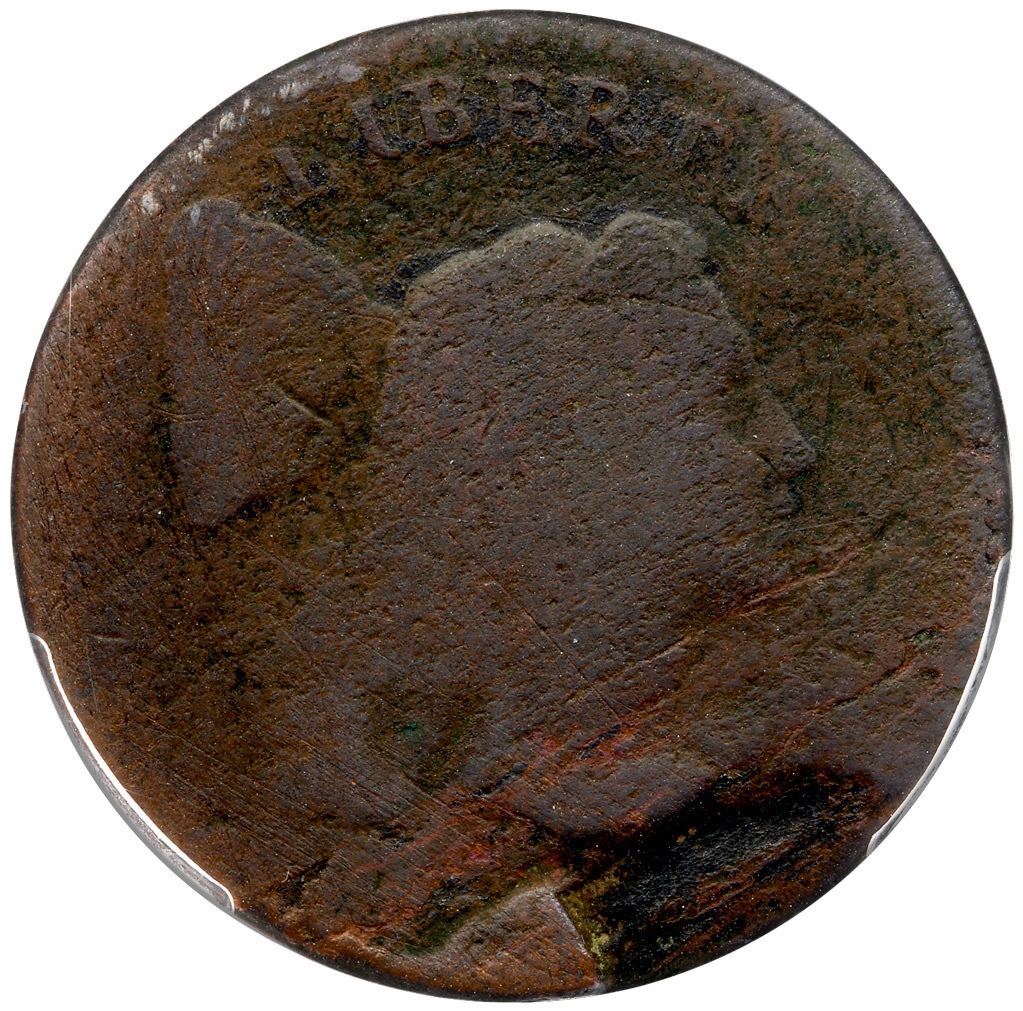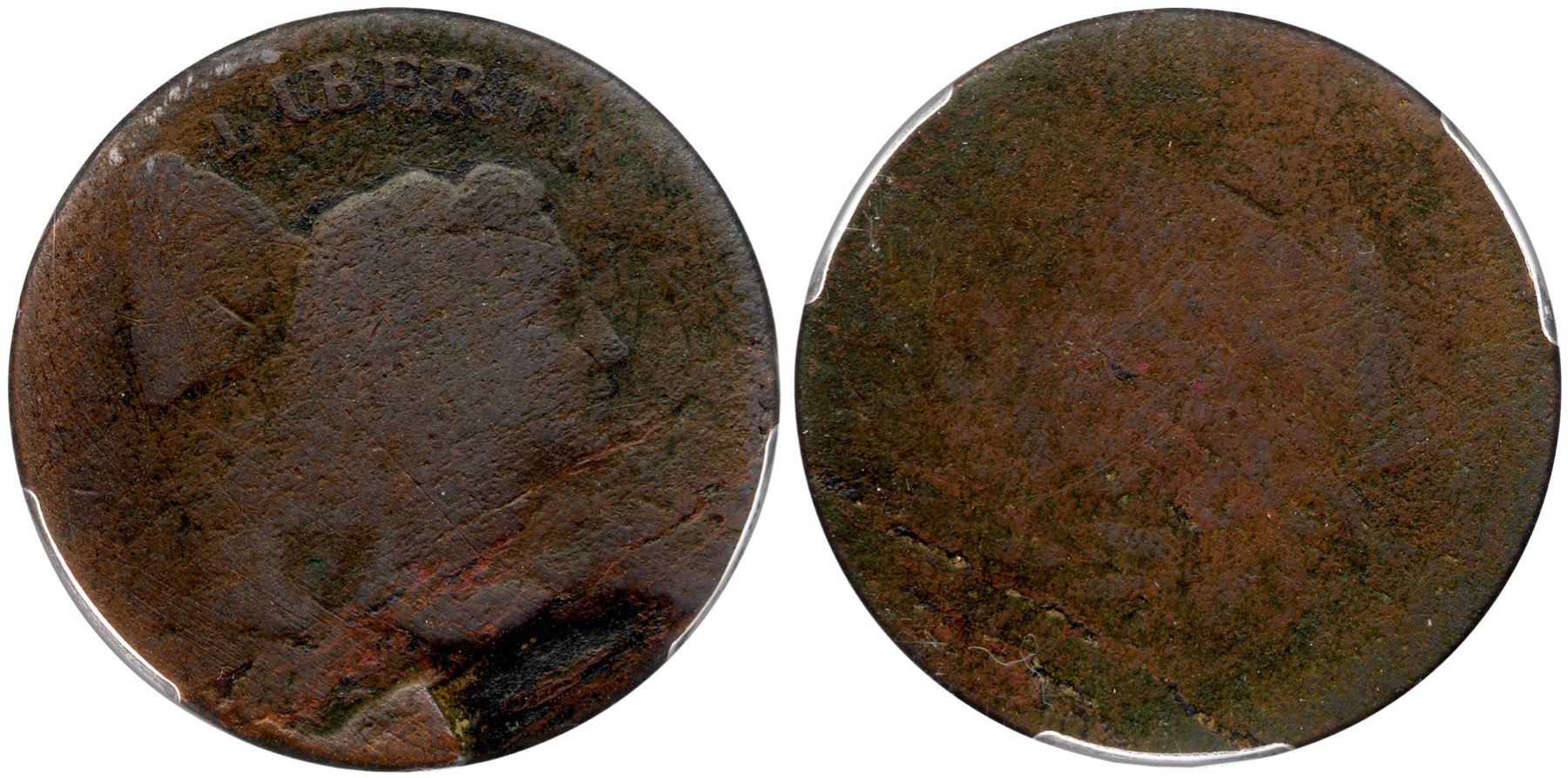 Sharpness stronger on the obverse than the reverse, but the surfaces are granular and there is an ugly planchet lamination at the date and bust tip. Part of the 7 is visible and LIBERTY is readable but the rest of the date and nearly all of the reverse are gone. Fortunately there are enough of the border beads above LIBERTY still visible (although weak) to attribute the variety. Early die state with a strong E in LIBERTY. Our grade is net Basal State-1. The attribution is noted on the PCGS label.