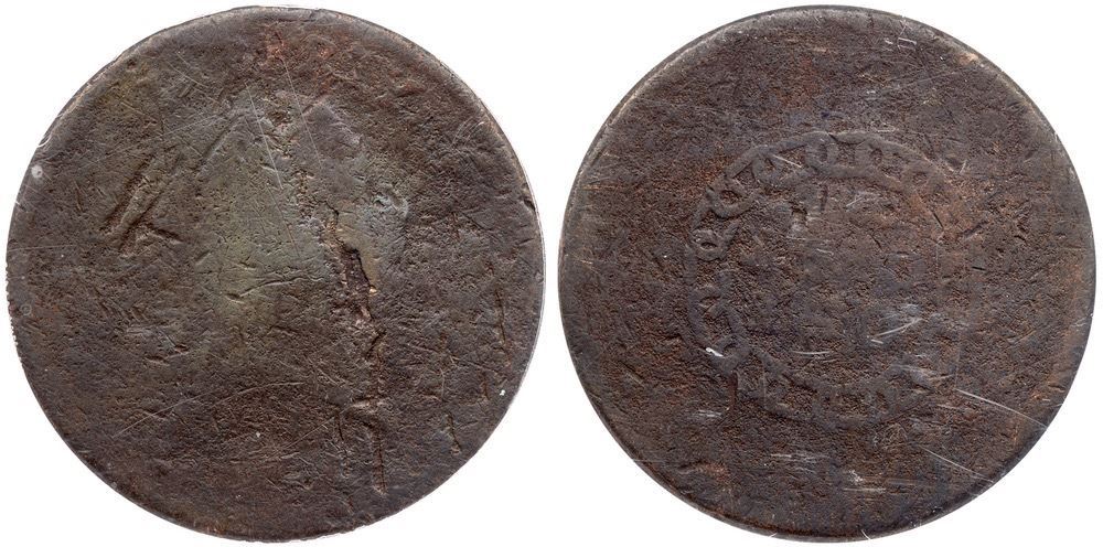 Slightly glossy chocolate brown. Heavily worn. There is no trace of the date but most of LIBERTY and the chain remain visible. Covered with fine roughness and there are some significant nicks in the field behind the head, but the major defect is the quality of the planchet. There are several parallel planchet lamination streaks on the right half of the obverse, the strongest from the cheek to the rim at the end of the bust. Our grade is Basal State-1+.