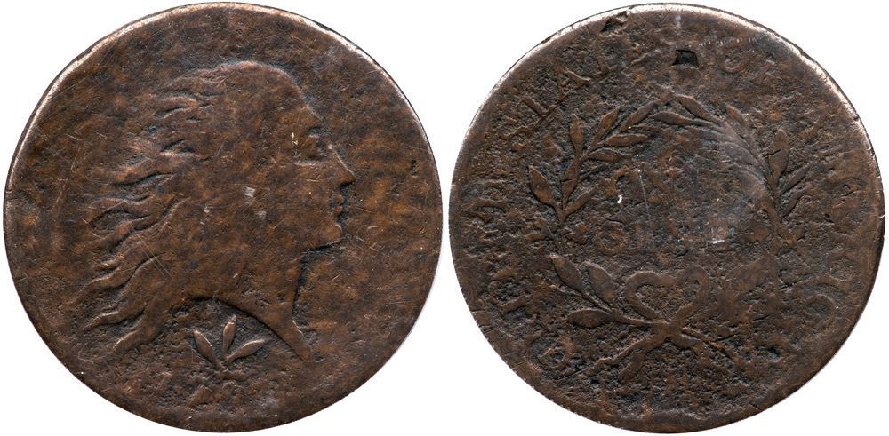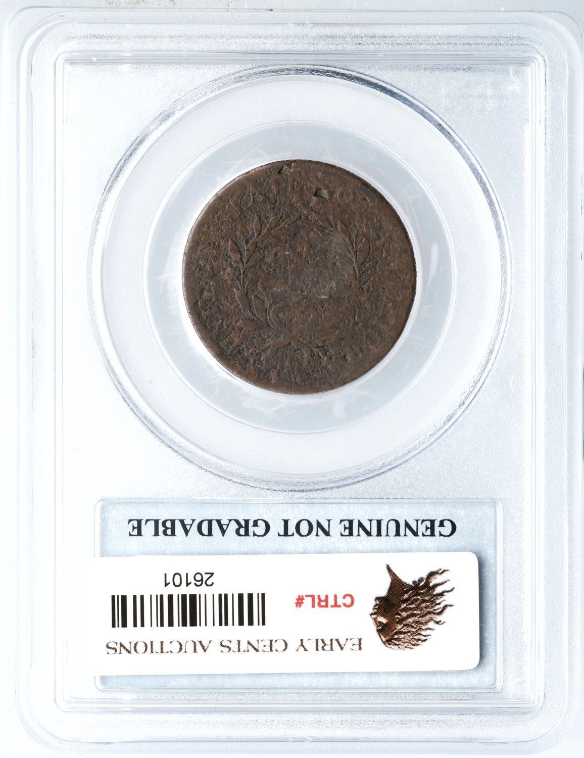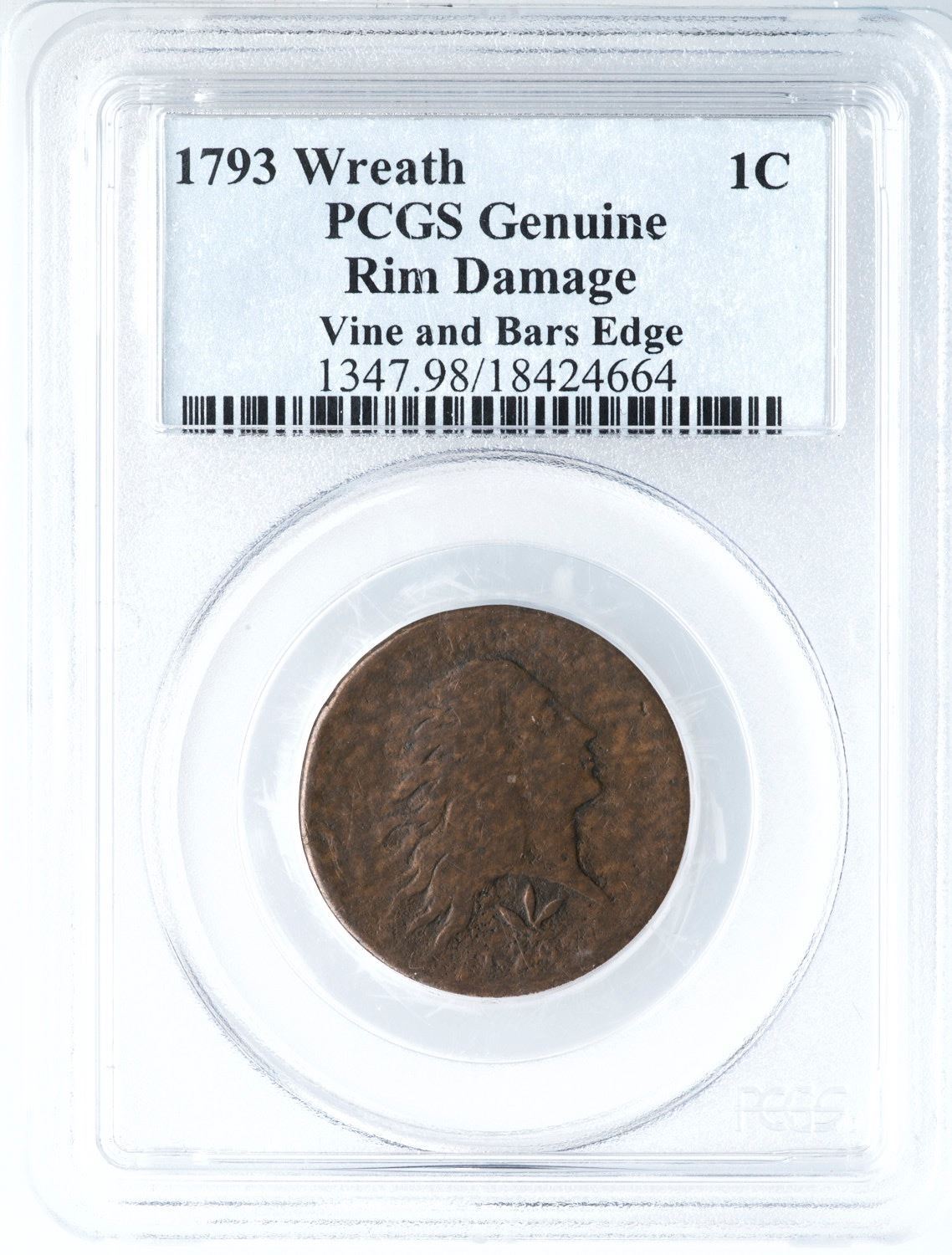 1793 S-9 R-2 PCGS Genuine (Rim Damage)G5 sharpness but there is fine roughness and microporosity in some of the protected areas. There are also a couple notable digs atop TE and right of the last S in STATES, though whatever earned the "RIm Damage" qualifier by PCGS is hidden by the holder. Mottled chocolate and dark brown surfaces. Despite the minor surface issues the date is fully readable, as are most of the legends. Our grade is AG3.Certificate Number: Certificate # 1347.98/18424664