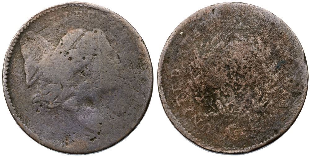 Glossy olive brown and steel. Mostly smooth on the obverse but there is minor roughness on the reverse. No verdigris but there are some small marks, mostly in the hair. Unevenly struck, weakest on the right side of the obverse. The date is gone.