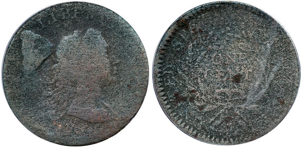 1794 S-19b R-4 Head of 1793 ANACS G4 Details (Corroded)Good sharpness but covered with uniform roughness and a few scattered spots of verdigris on the reverse. Cleaned and now toned dark olive and medium browns with faint hairlines remaining across the obverse surfaces. Weak date but can be made out in hand under a lamp, partial legends, mostly outlined portrait and wreath. Breen state I. Our grade is FR2.Certificate Number: Certificate Number# 7686495