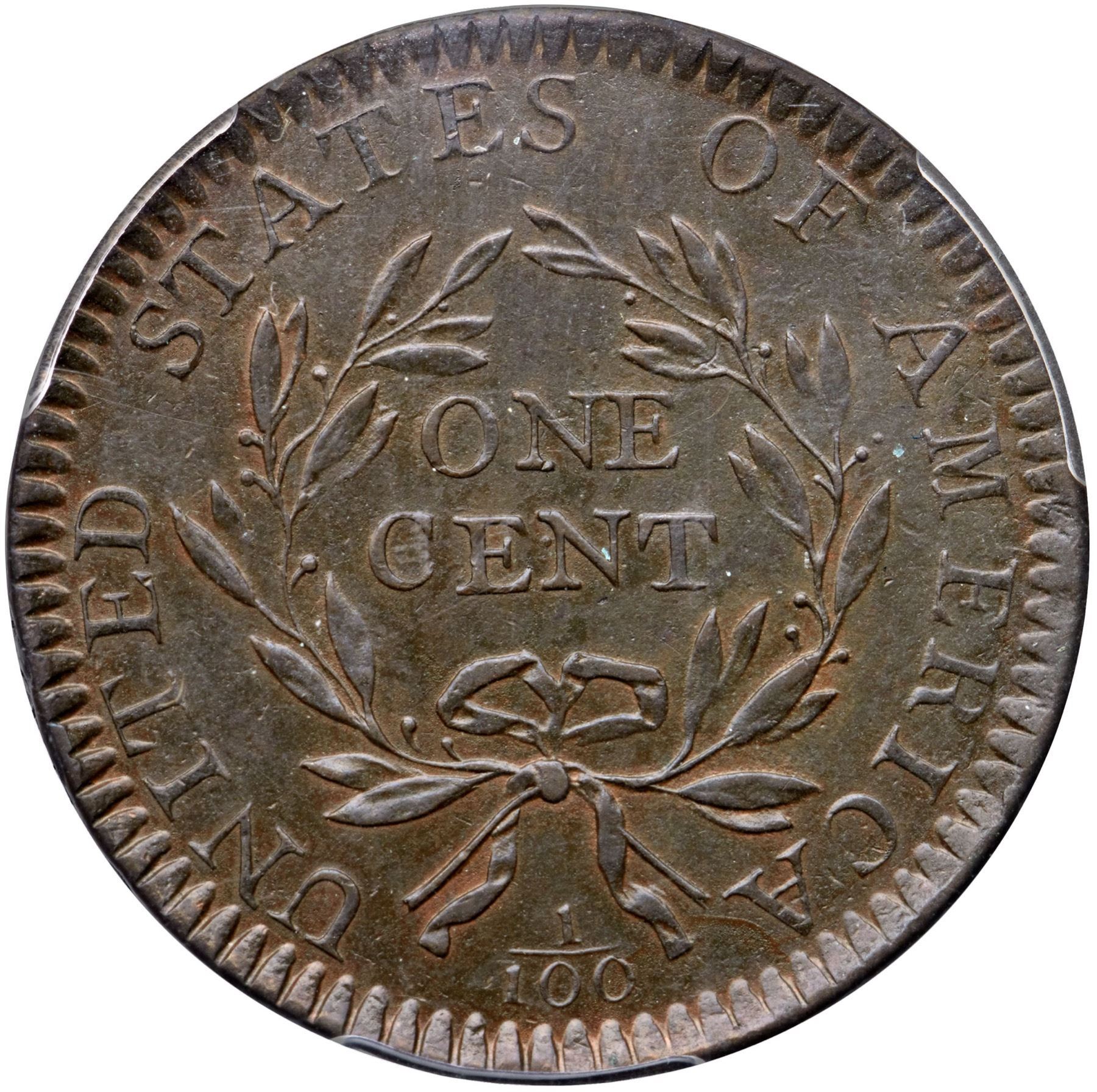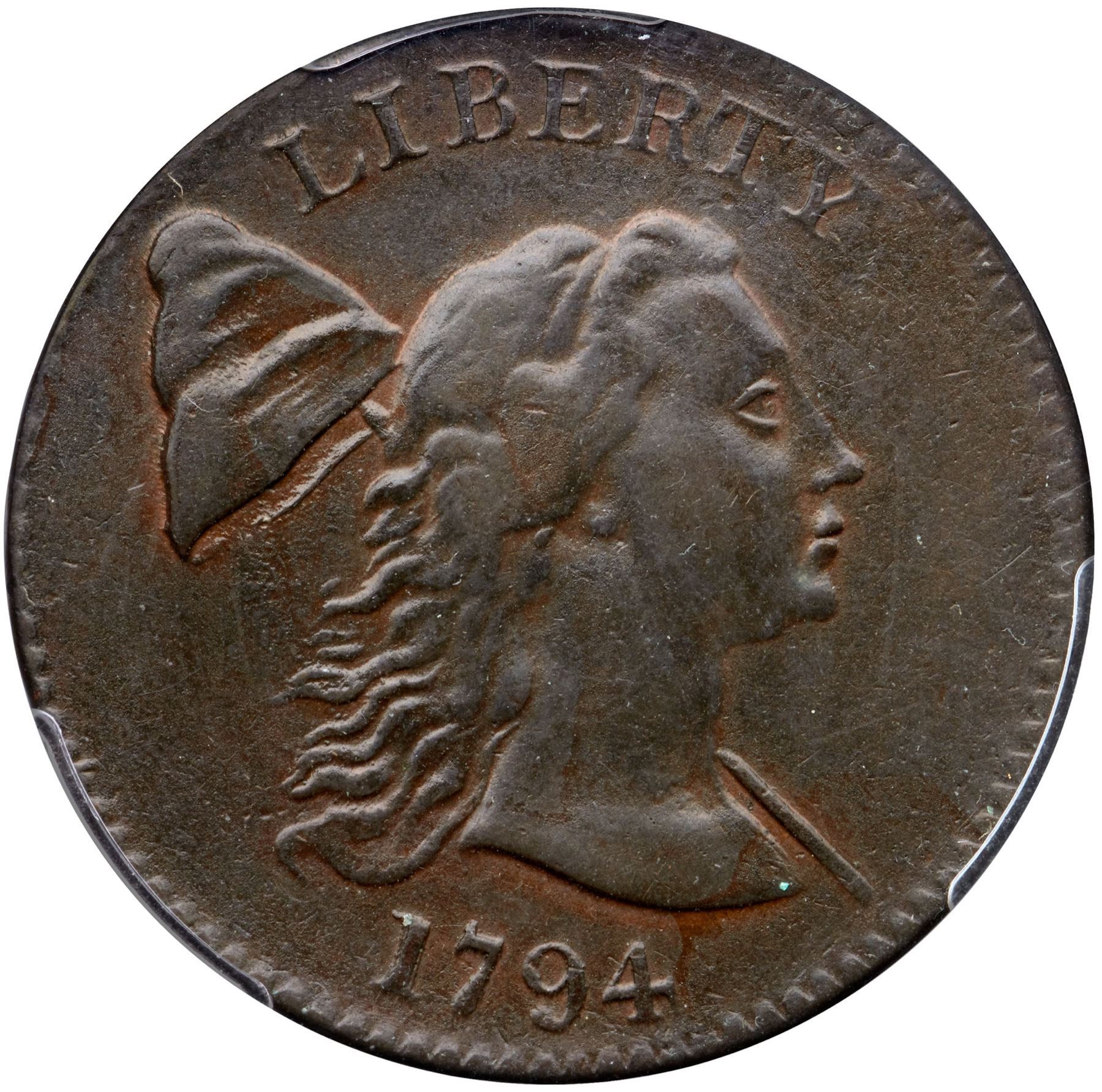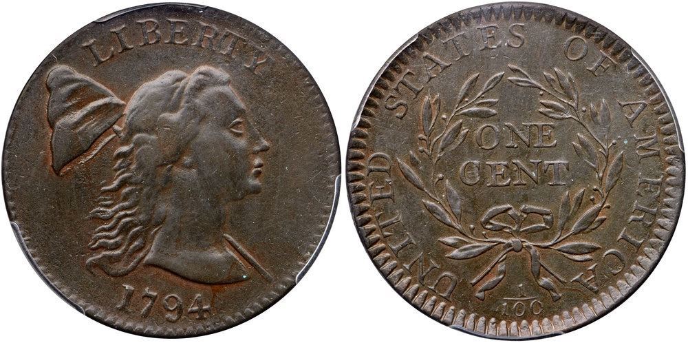 Glossy olive and dark steel brown with frosty lighter steel brown in protected areas on both sides, mostly on the obverse. No spots, stains, or contact marks. A very nice example of the Head of 1793 type with smooth surfaces and virtually no defects. The best identifying marks are a very thin planchet void at the top of the cap and a microscopic and a very dull pinprick under the right foot of the T in LIBERTY. Neither mark is visible to the unaided eye. M-LDS, Breen state II early. The first wave under the cap is clear and the second wave down from the left bottom of the cap is just starting to appear. This cent is plated in the 1923 Chapman reference on the cents of 1794 (Obverse as "2", Reverse as "2. R.1"), and it is the plate coin for the variety in the 1991 Noyes reference on the cents of 1793-1814. Graded EF45 net EF40 and tied for CC#1 in the Noyes census, his photo #21845. Bland says EF40 and tied for CC#1. Our grade is EF40. A superb example of the Head of 1793 type, and it comes with a very nice provenance. The attribution and Naftzger-Reynolds provenance are noted on the PCGS Secure label.