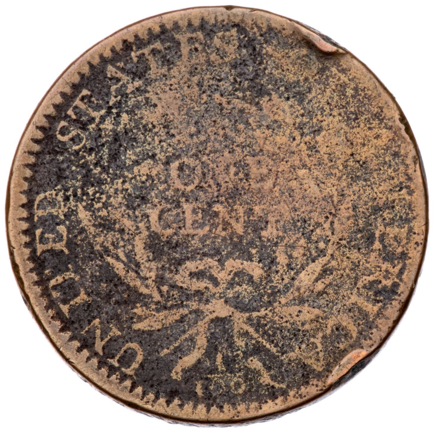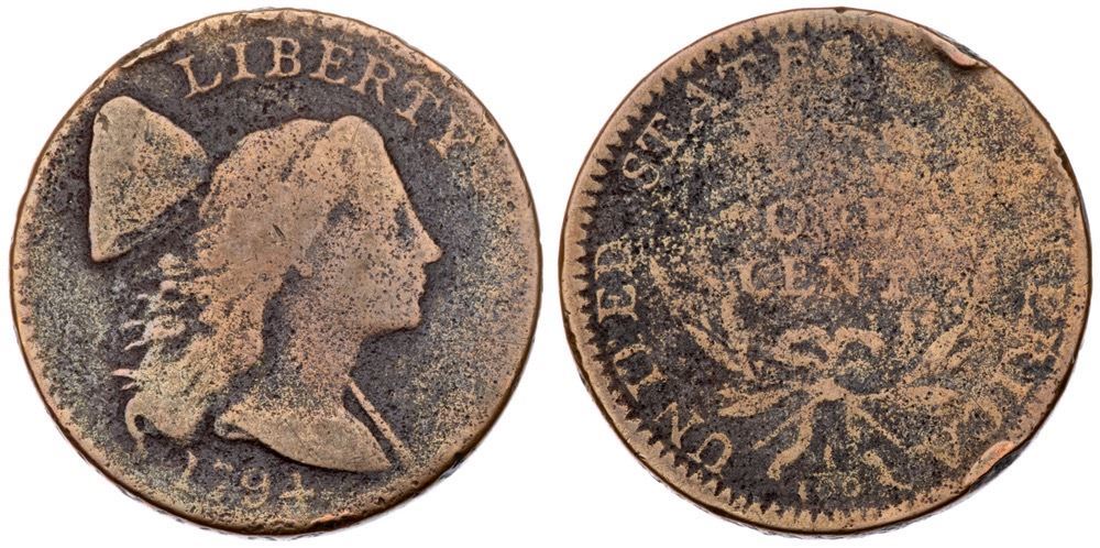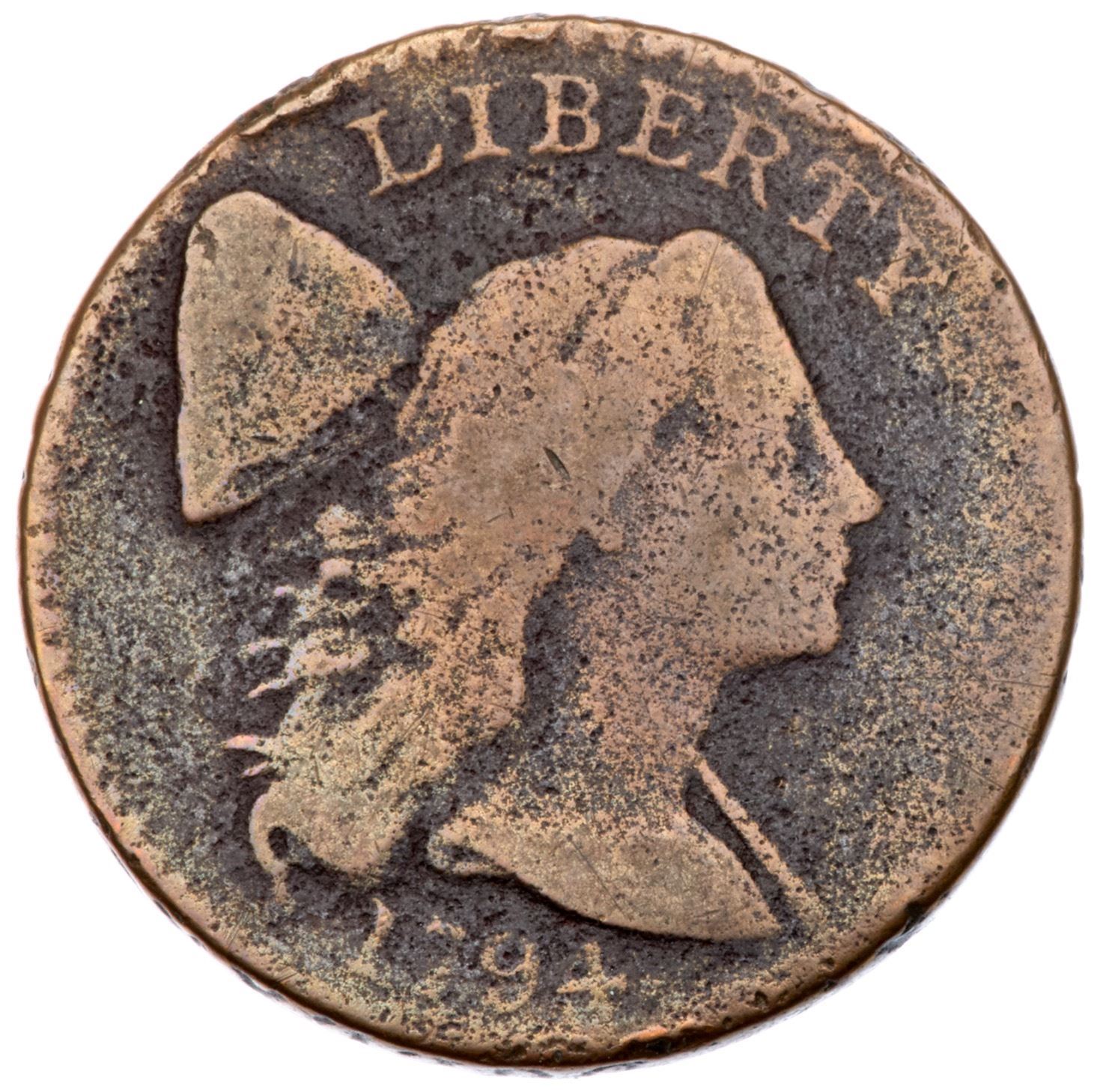 1794 S-30 R-1 G4A couple points sharper but covered with light roughness on al but the highest points, which are smoother from an old cleaning. Now toned medium brown on the devices with deeper maroon and steel on the fields and protected areas. There are a couple notable rim bruises, one above O in OF and another over CA in AMERICA. Readable date and legends.Certificate Number: