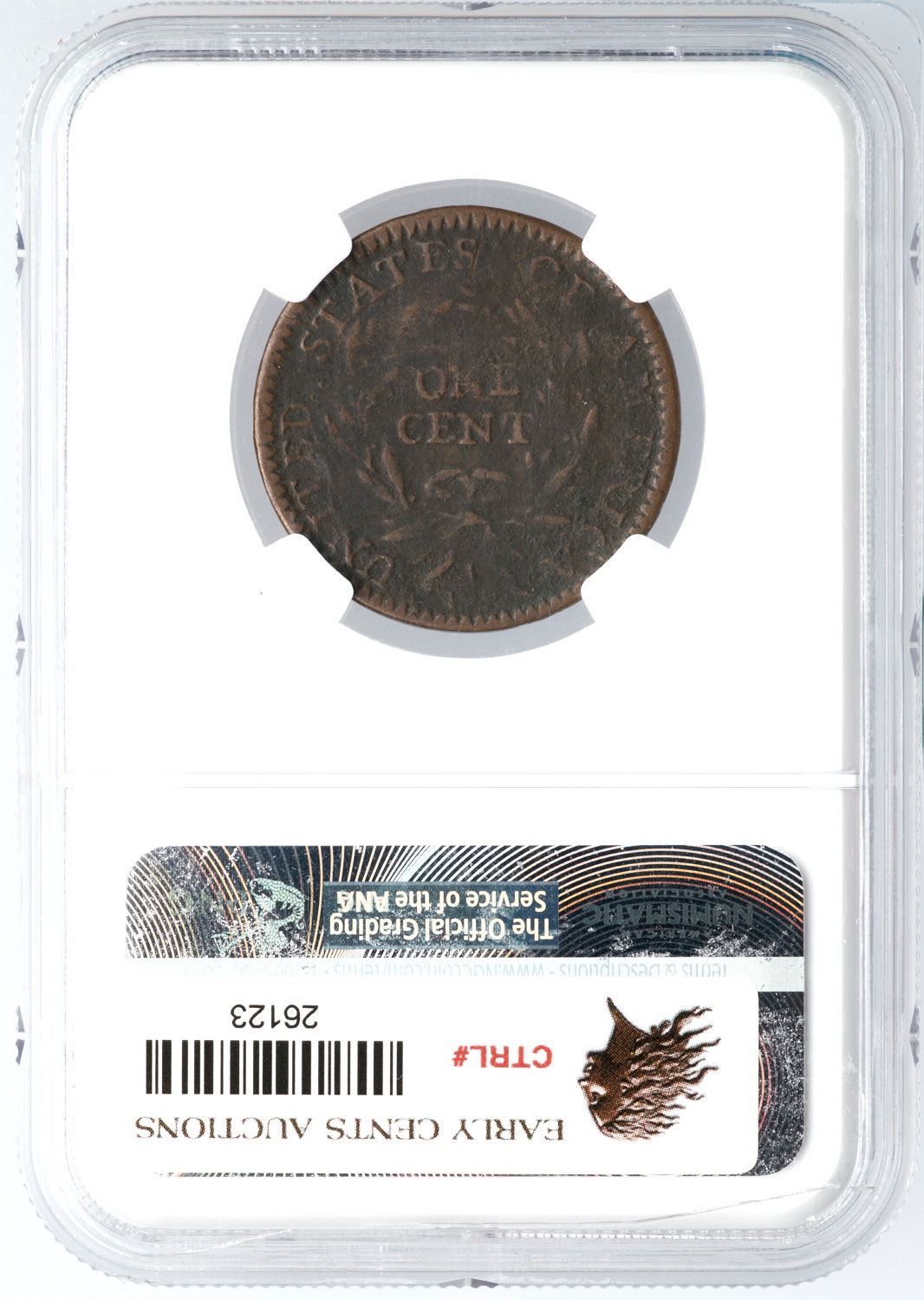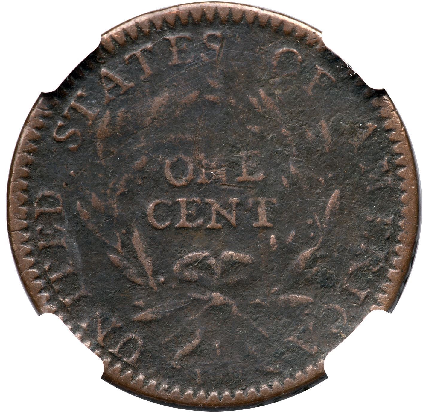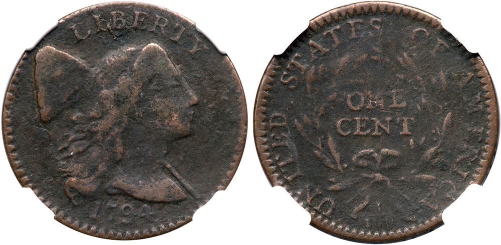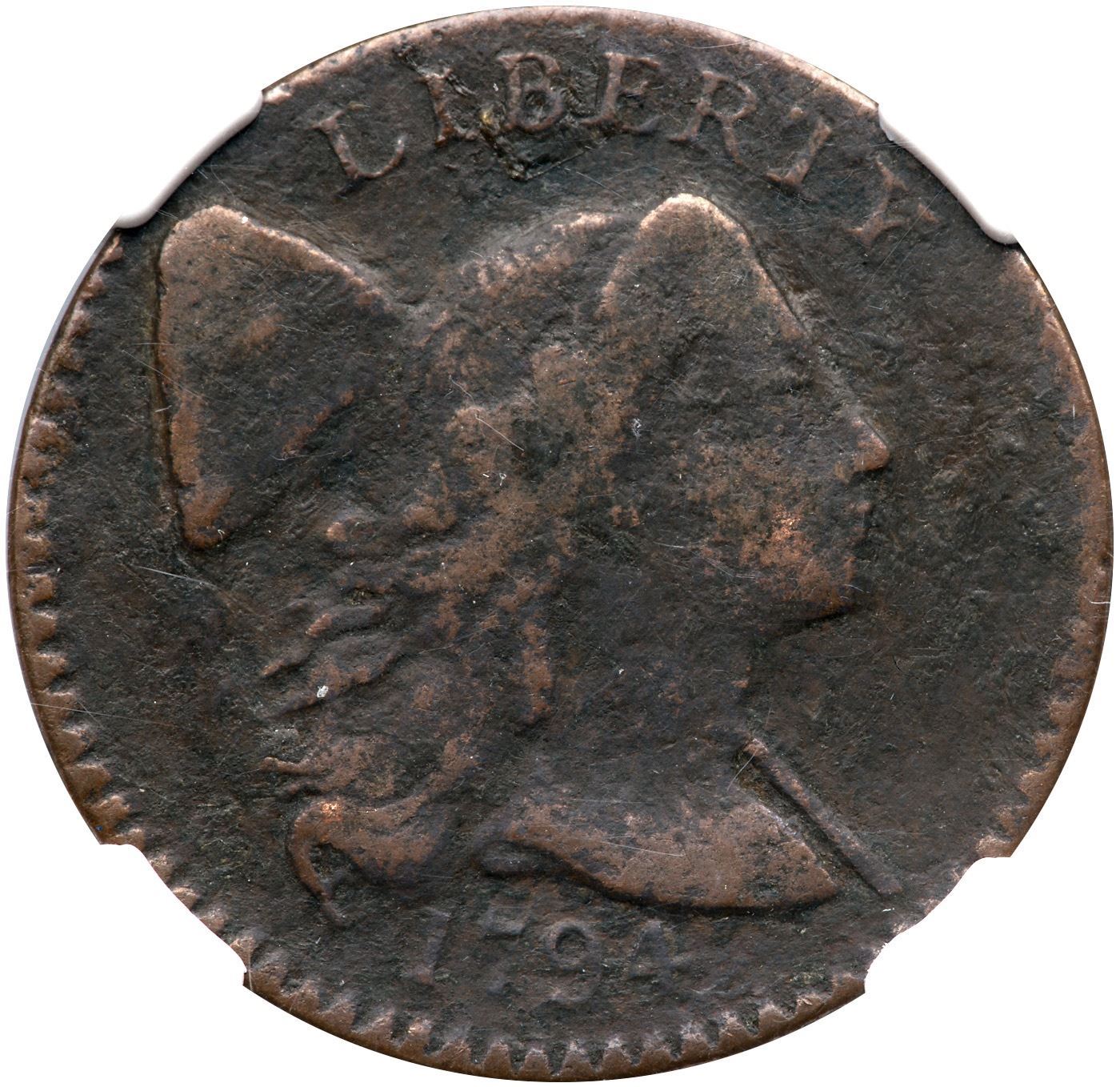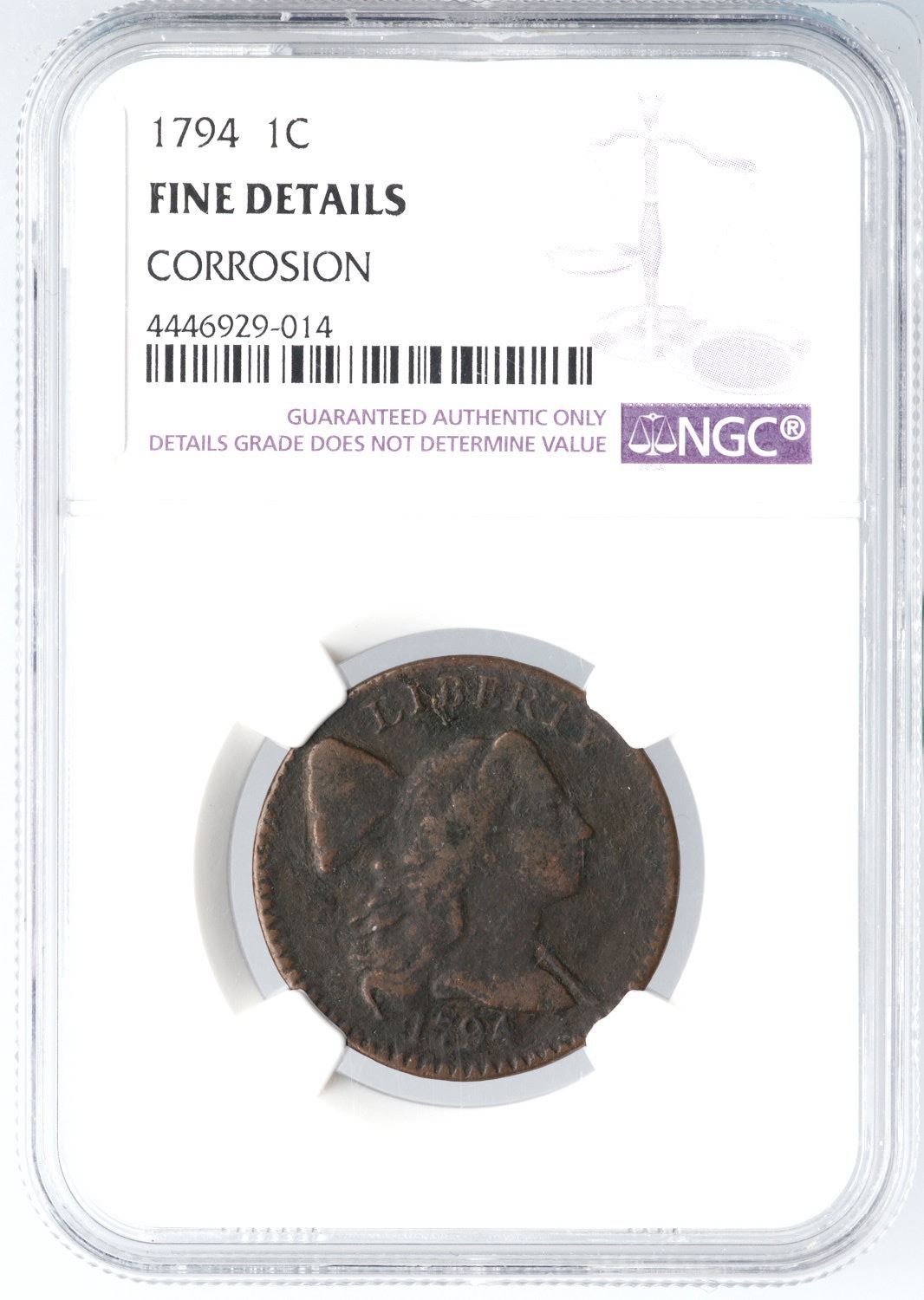 1794 S-30 R-1 NGC Fine Details (Corrosion)Fine sharpness but fine roughness covers the surfaces, more so around IBE on the obverse and ERICA on the reverse. The only marks are a couple wispy hairline scratches from the last S in STATES down through N in ONE. Dark brown and dark olive surfaces with hints of lighter brown on some high points. Our grade is VG7.Certificate Number: Certificate # 4446929-014