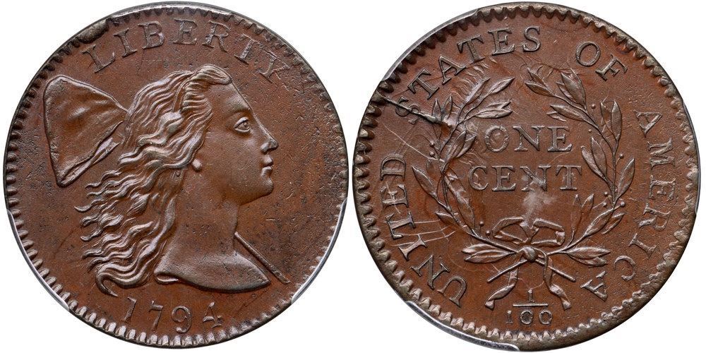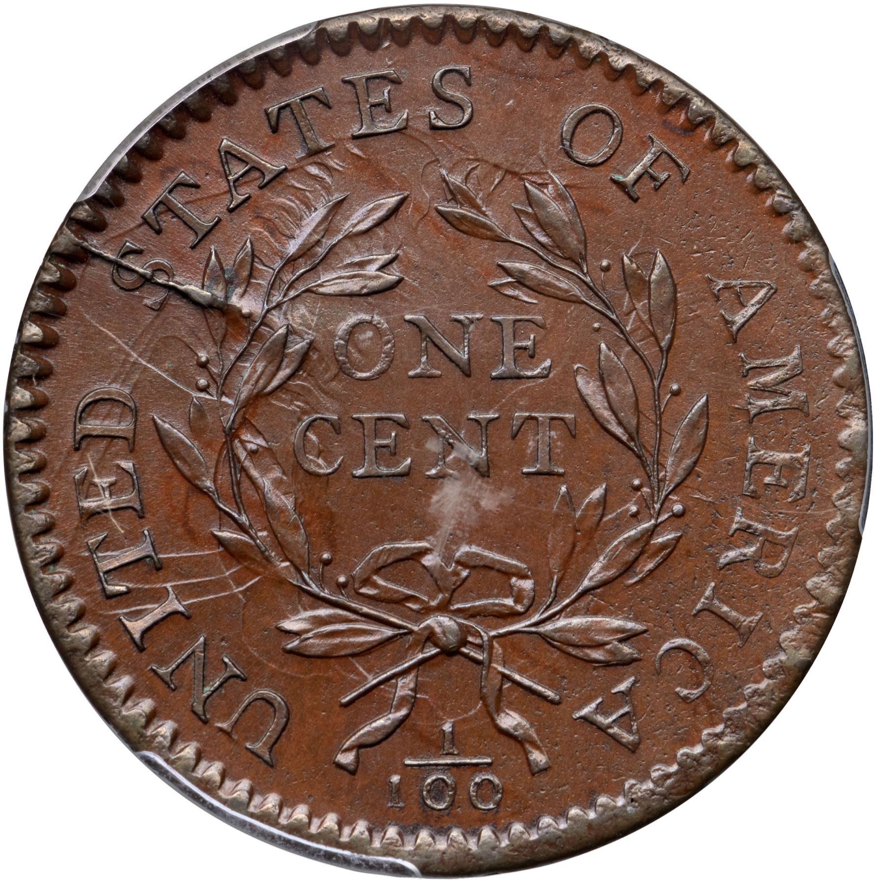 Lustrous medium brown and light chocolate. A sharp cent that has great eye appeal, but it was unevenly struck, as usual with this variety. The die faces were not parallel (Breen calls this axial misalignment) pressing the planchet more strongly on the left side then on the right. The result is a very strong strike on the left and in the centers but with weakness along the right edge of both sides. Perhaps that's why the reverse die cracked so early in the marriage. The weakly struck areas display many of the tiny planchet imperfections that normally strike out. These minor planchet imperfections are evident along the right edge on all the high grade examples listed in the Noyes census. Otherwise this piece is free of marks or other notable defects. M-LDS, Breen state IV. The cud break at LI in LIBERTY is clear and the crack from the rim through the first S in STATES extends heavily through the wreath toward the O in ONE. Called MS63 Choice and CC#2 in the Noyes census, his photo #22633. Bland says MS60 and CC#2 behind a slightly finer example on his census list. Our grade is MS60. The attribution and Gerrie provenance are noted on the PCGS label.