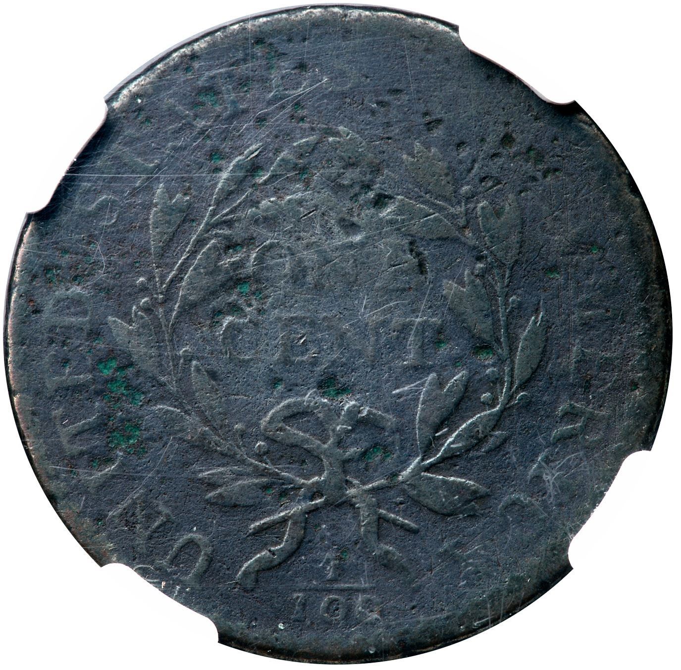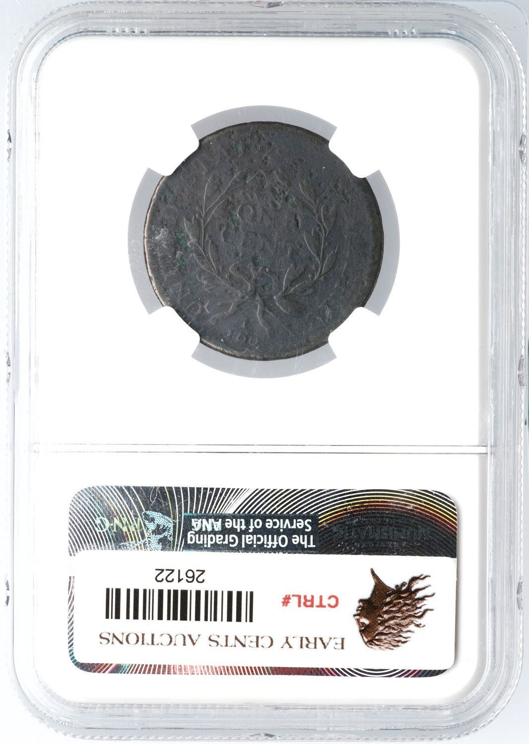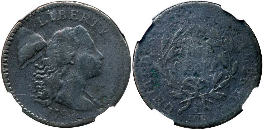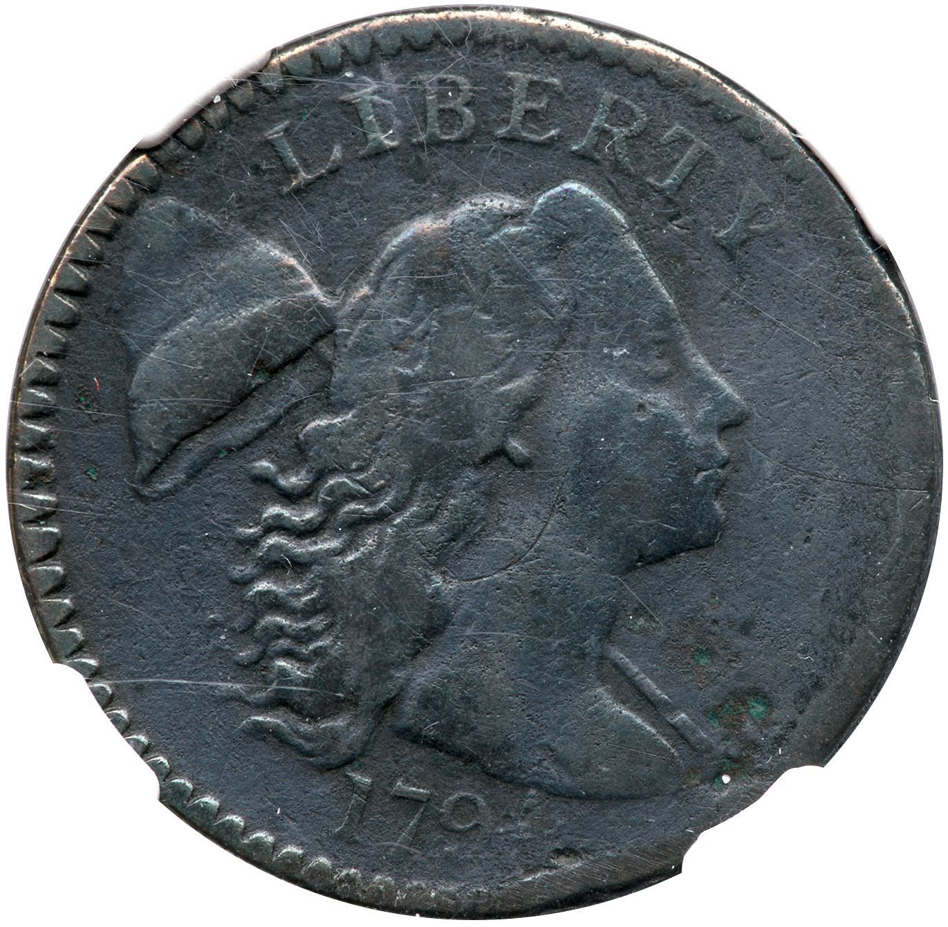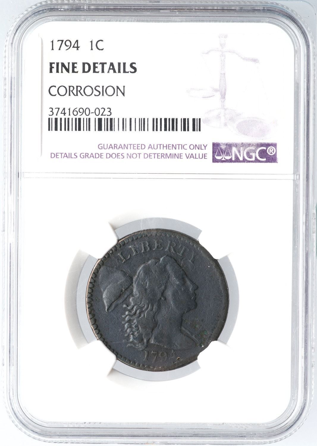 1794 S-43 R-2 NGC Fine Details (Corrosion)Fine sharpness but there are scattered pits on either side, some containing traces of old verdigris. There are also minor bruises along the upper obverse rim, a more notable one under 4 in the date, and a curved hairline scratch from the cheek through the neck into the hair. Dark olive and bluish steel patina. Other than weakness at OF, the legends are readable and the date is clear. Our grade is VG7.Certificate Number: Certificate # 3741690-23