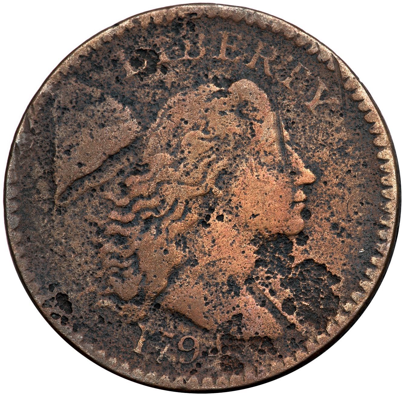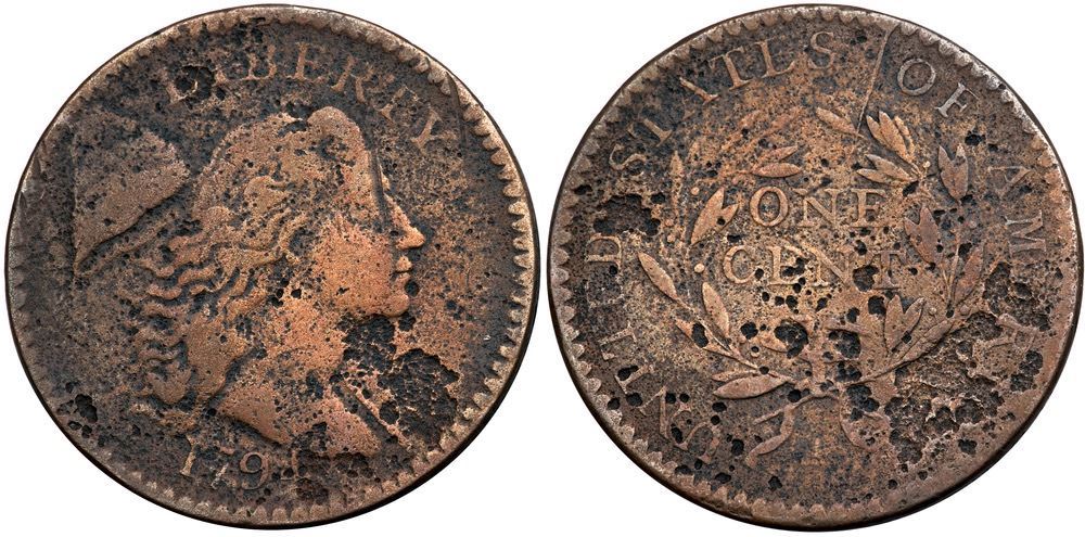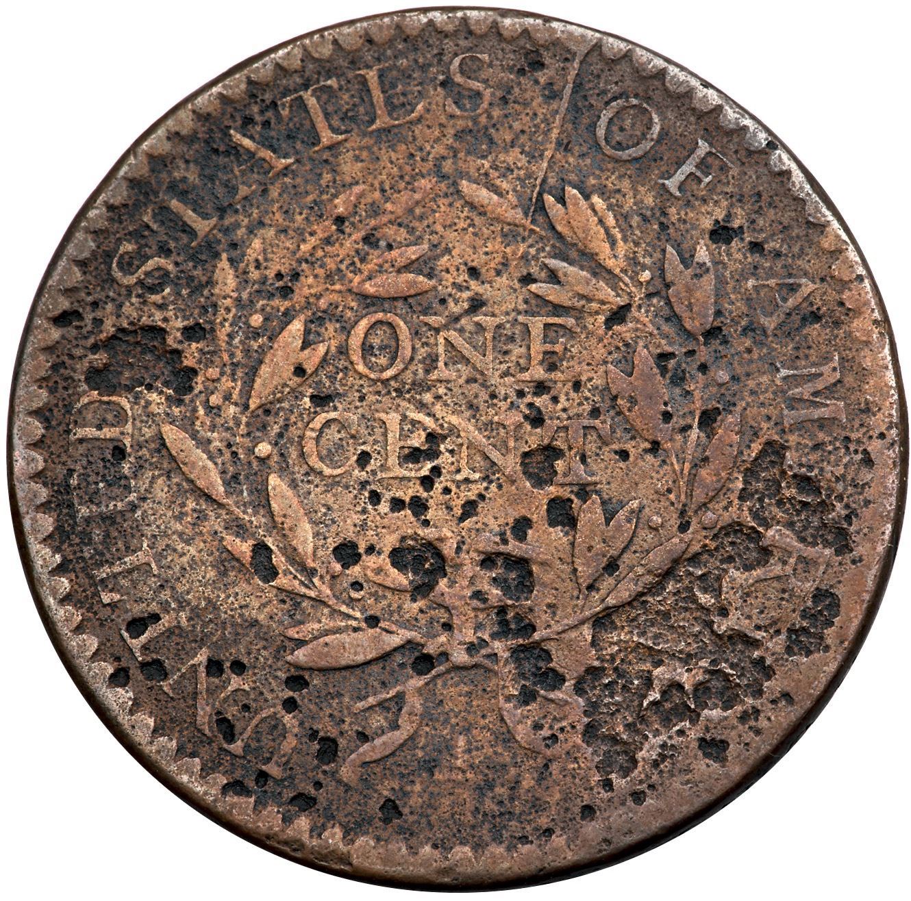 1794 S-44 R-1 G5F15 sharpness but fine porosity and moderate pitting is scattered across the surfaces of both sides, most notably above the pole, right of the date, and around ERICA. Other than E CA in AMERICA, the legends and date are full. Light to medium brown with deeper steel in the protected areas.Certificate Number: