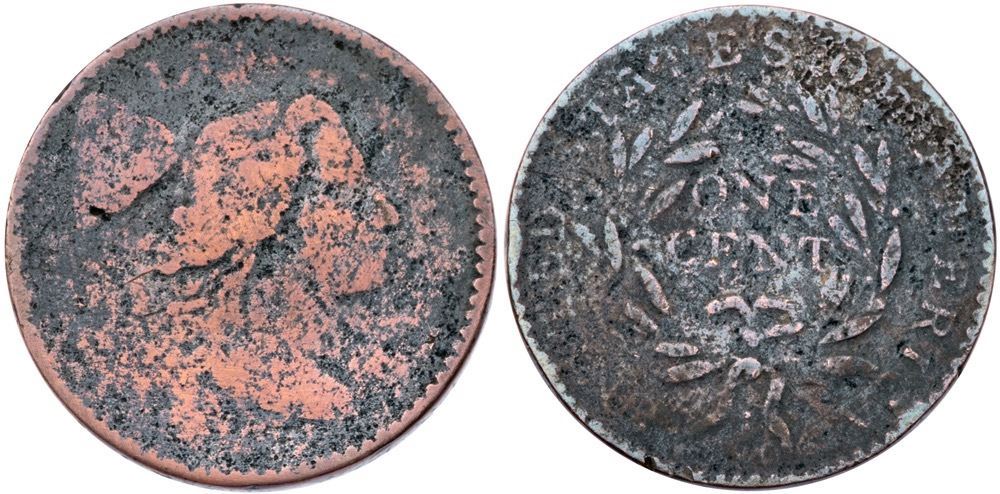 1794 S-49 R-2 FR2VG sharpness but corroded with porosity and roughness on the surfaces, somewhat smoothed by a cleaning. Now a mix of faded artificial red, dark brown, and charcoal. There are also a couple minor rim bruises at ED in UNITED and C in AMERICA. Most of the date and LIBERTY are gone, however the reverse legends are fairly readable. Certificate Number: