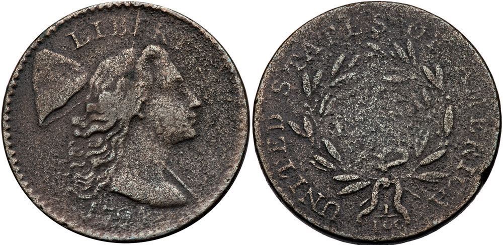 1794 S-49 R-2 VG7F12 sharpness but the surfaces are granular and there is a notable nick on the rim over I in AMERICA. The central reverse legends, Y in LIBERTY, and 4 are weak, but otherwise the legends and date are readable. Glossy chocolate and dark browns. OUr grade is VG7.Certificate Number: