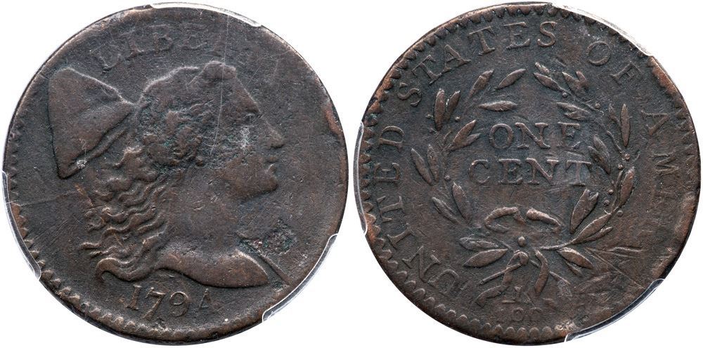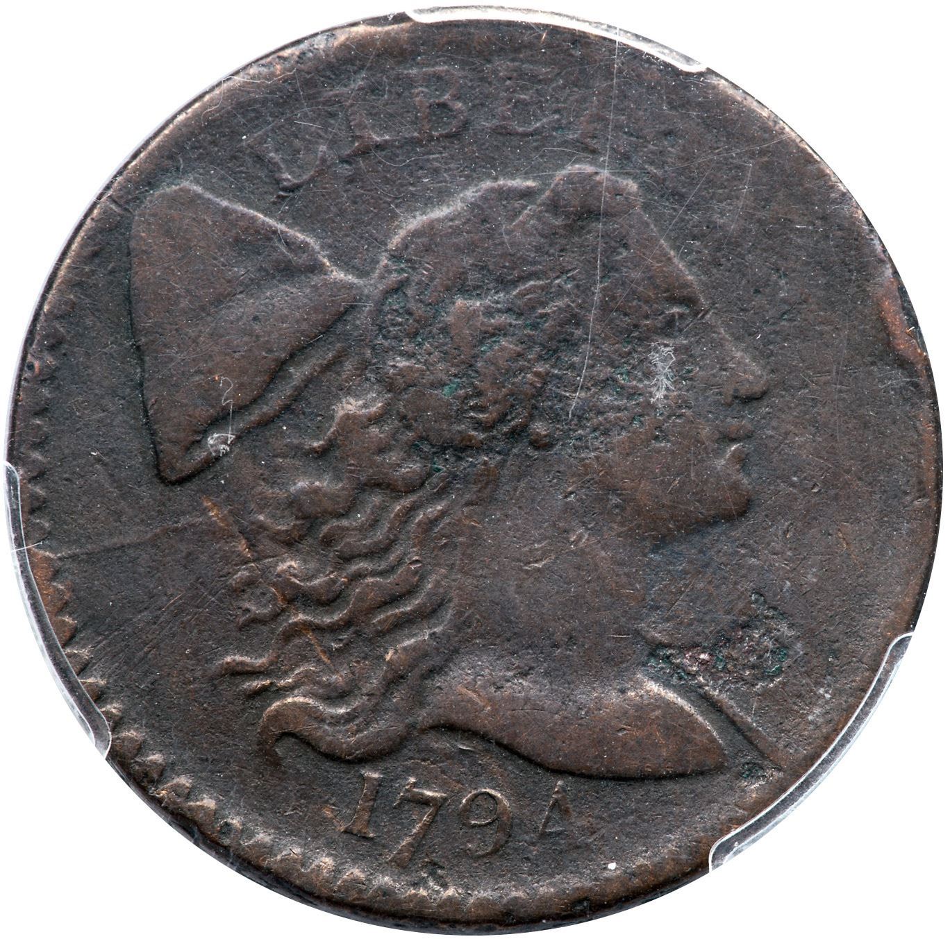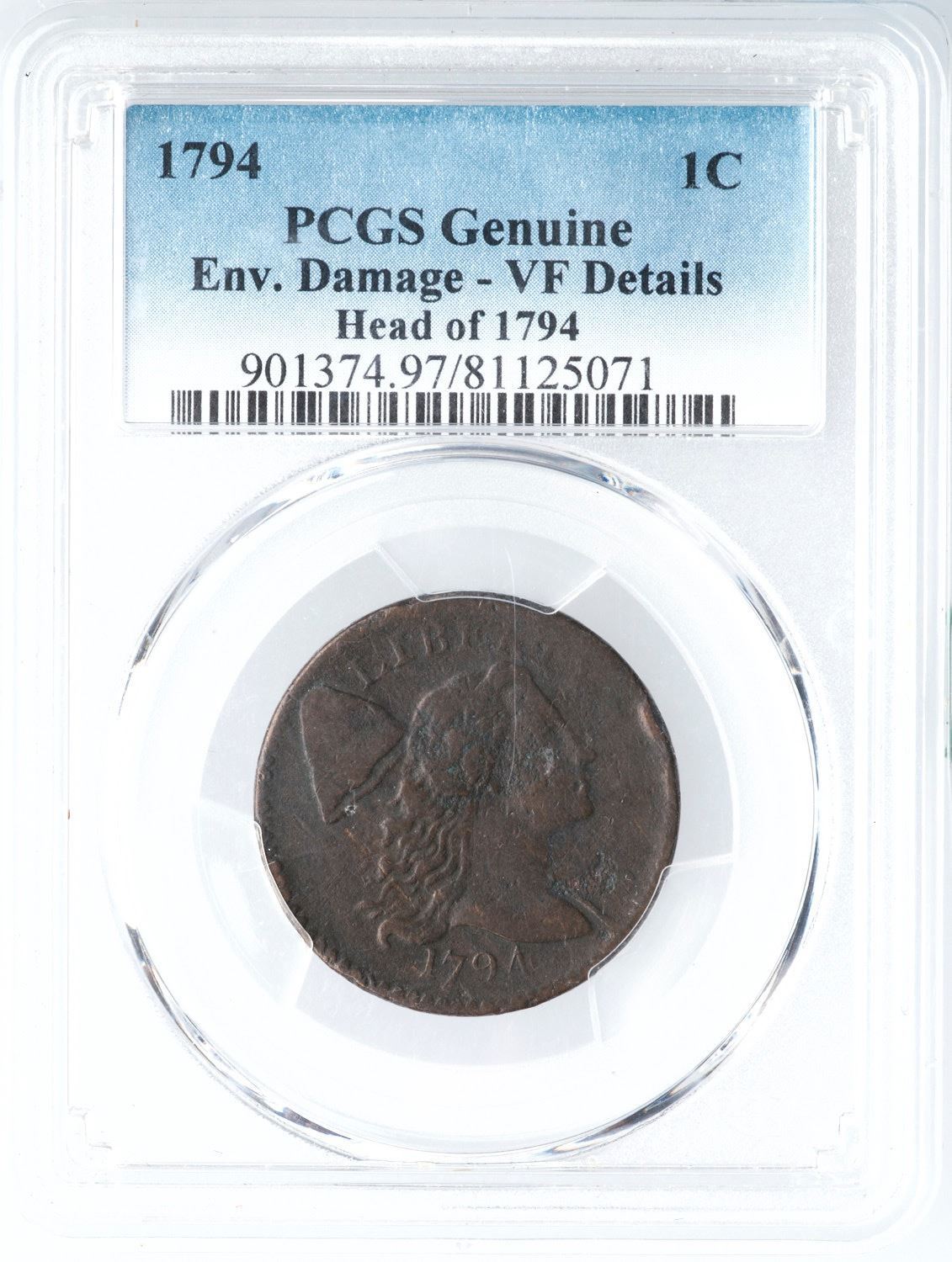 1794 S-56 R-3 PCGS VF Details (Env. Damage)VF20 sharpness but there is some light pitting on Liberty's face and hair, as well as above the bust tip. The notable marks include one rim bruise on the obverse before the nose, several around the reverse, and a cluster of old scratches at ICA that obscure the letters. The remaining legends are readable, bold date. Our grade is VG10.Certificate Number: Certificate # 901374.97/81125071