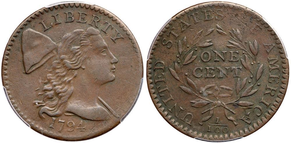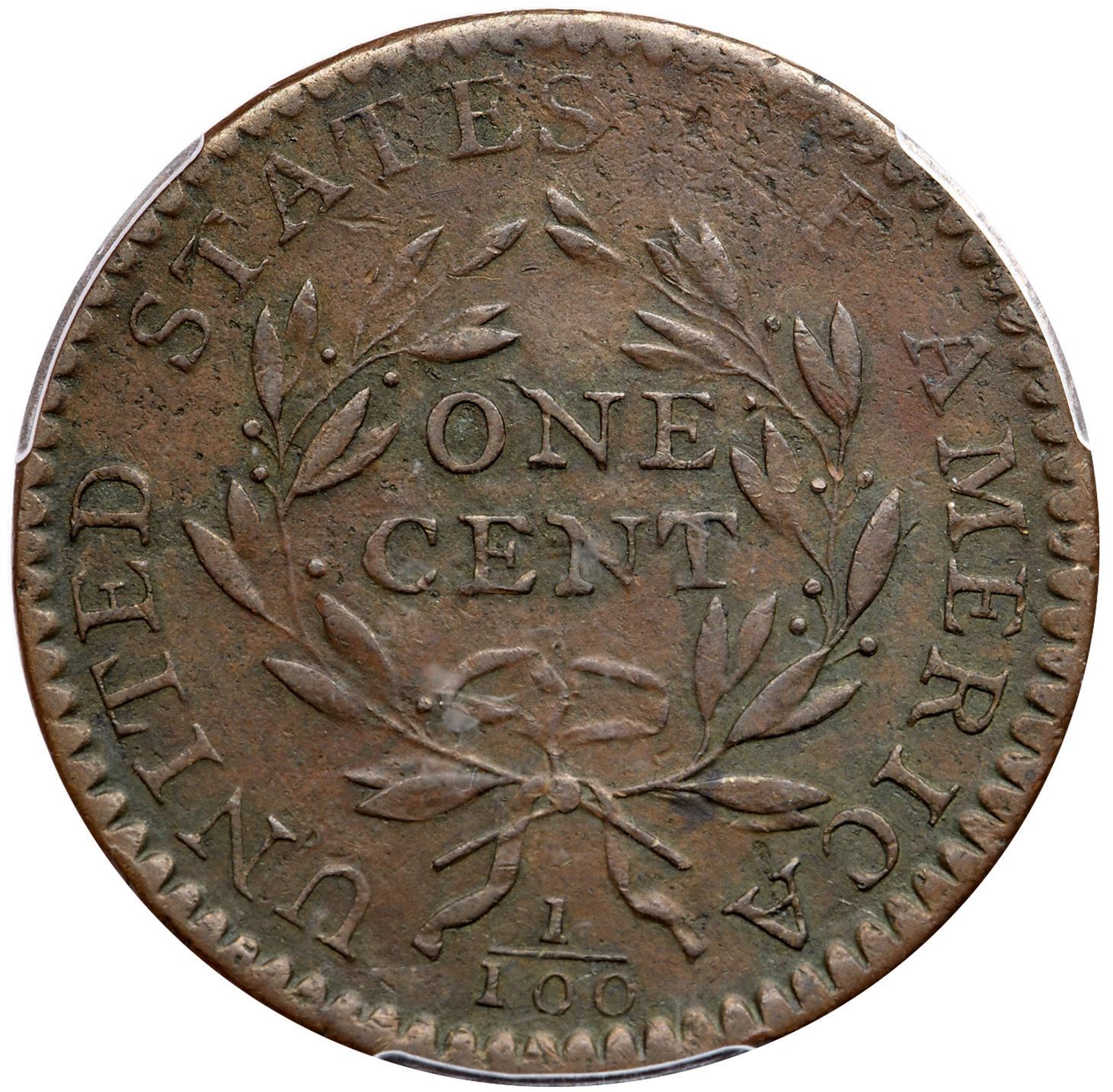 Rather frosty light olive and medium steel brown. Very light wear on the devices and no significant marks. The surfaces are slightly dull and there are some of the usual microscopic planchet flakes, mostly on the upper part of the reverse. The best identifying marks are a tick on the left side of the forehead, another mid-jawline, a couple small nicks at TA in STATES, and a spot of darker toning (not carbon) on the base of the leaves under CA. MDS, Breen state III, Heck 4, with a crack on the upper trench before the face. Struck slightly off center to K-5 leaving weakness at OF on the reverse. Graded EF45 net EF40 and tied for CC#14 in the Noyes census, his photo #61328. Our grade is EF40 net VF35+. 901374.45/25222397