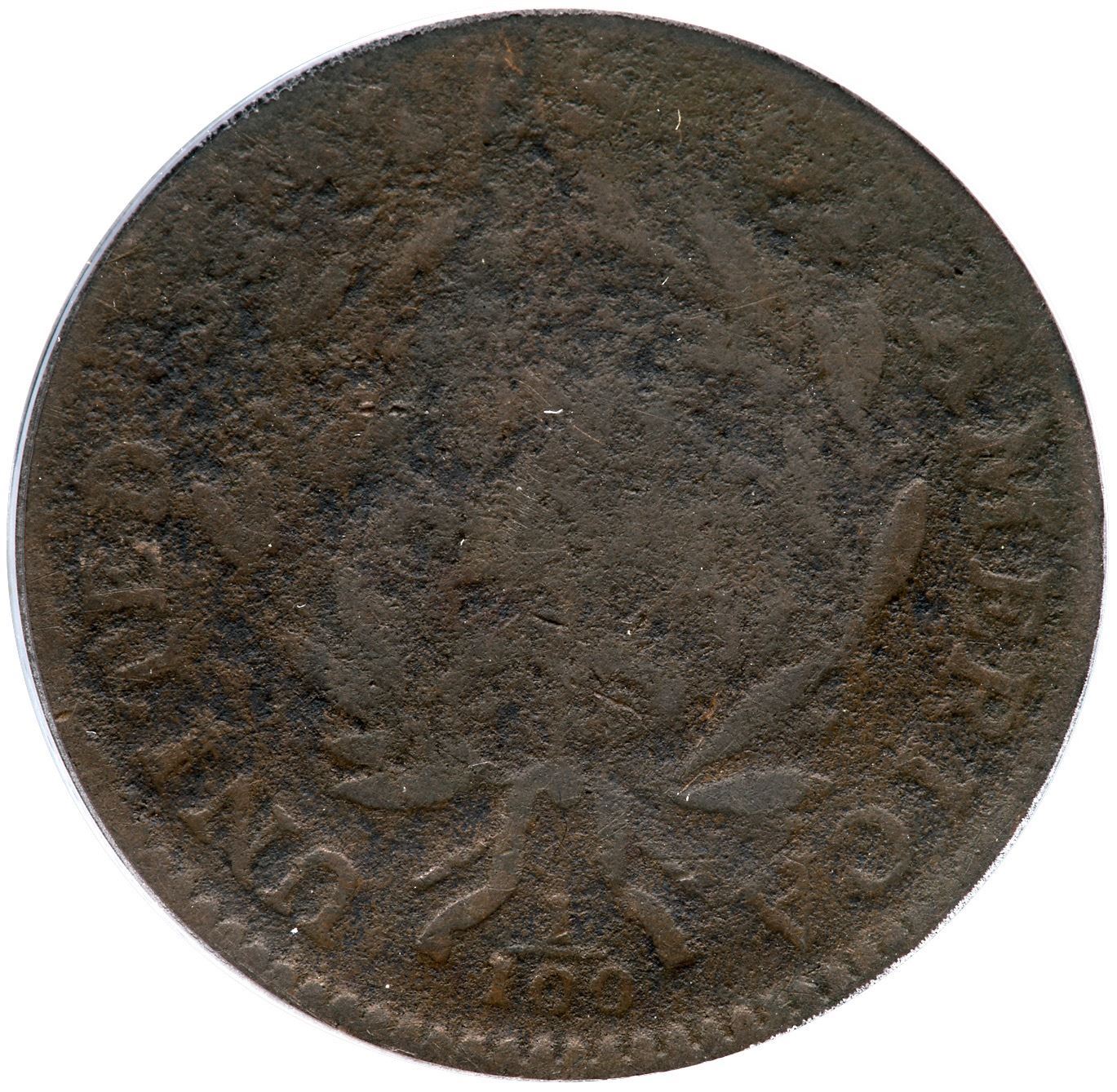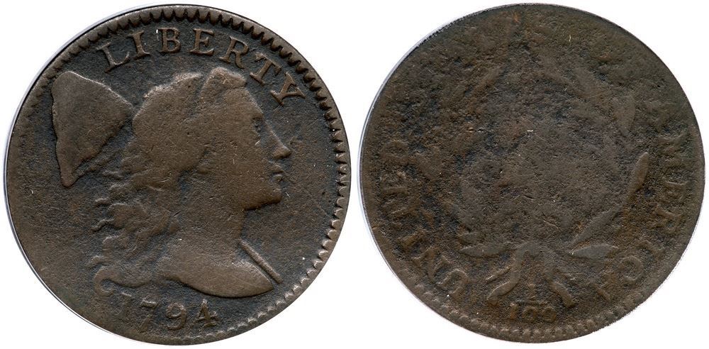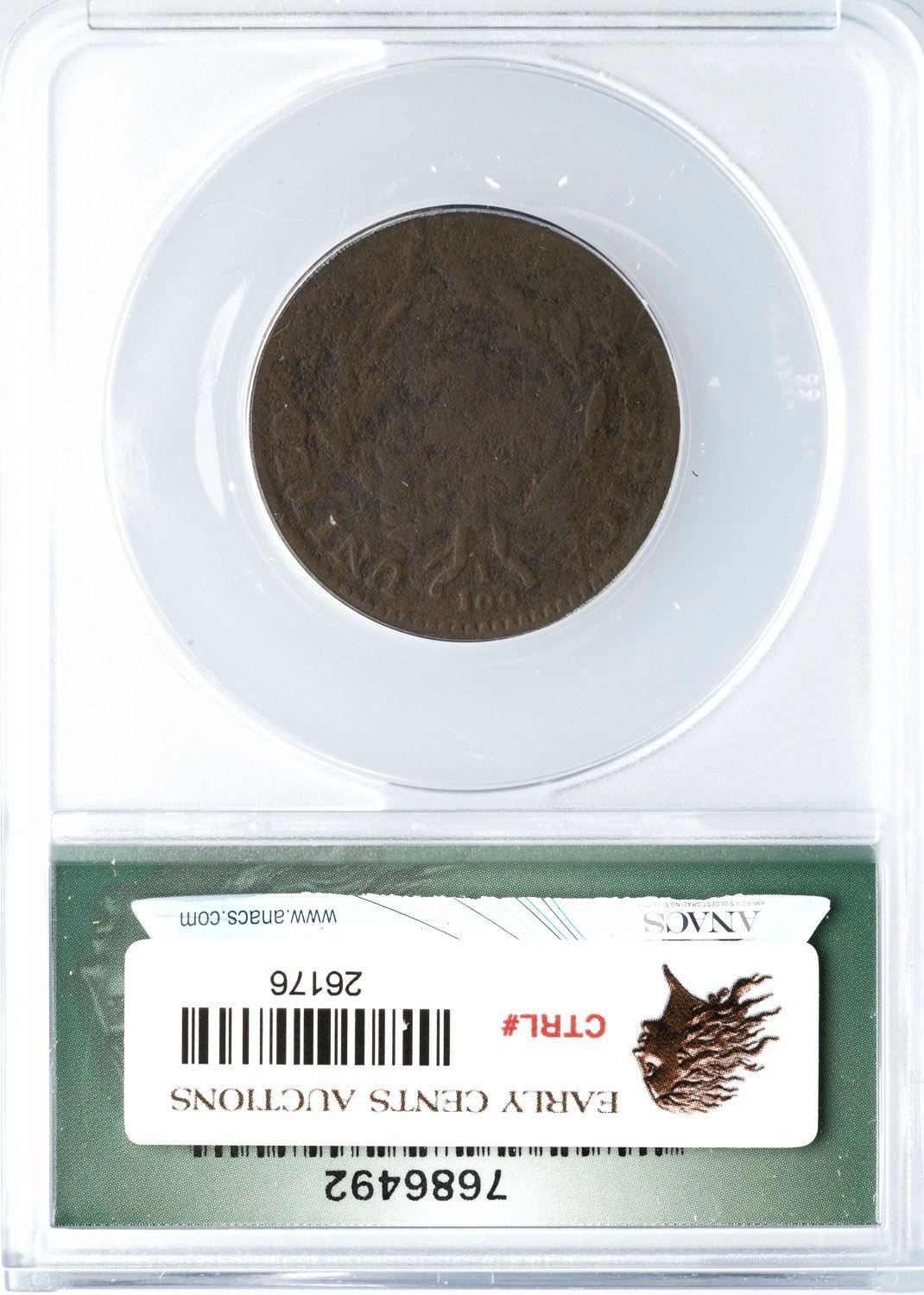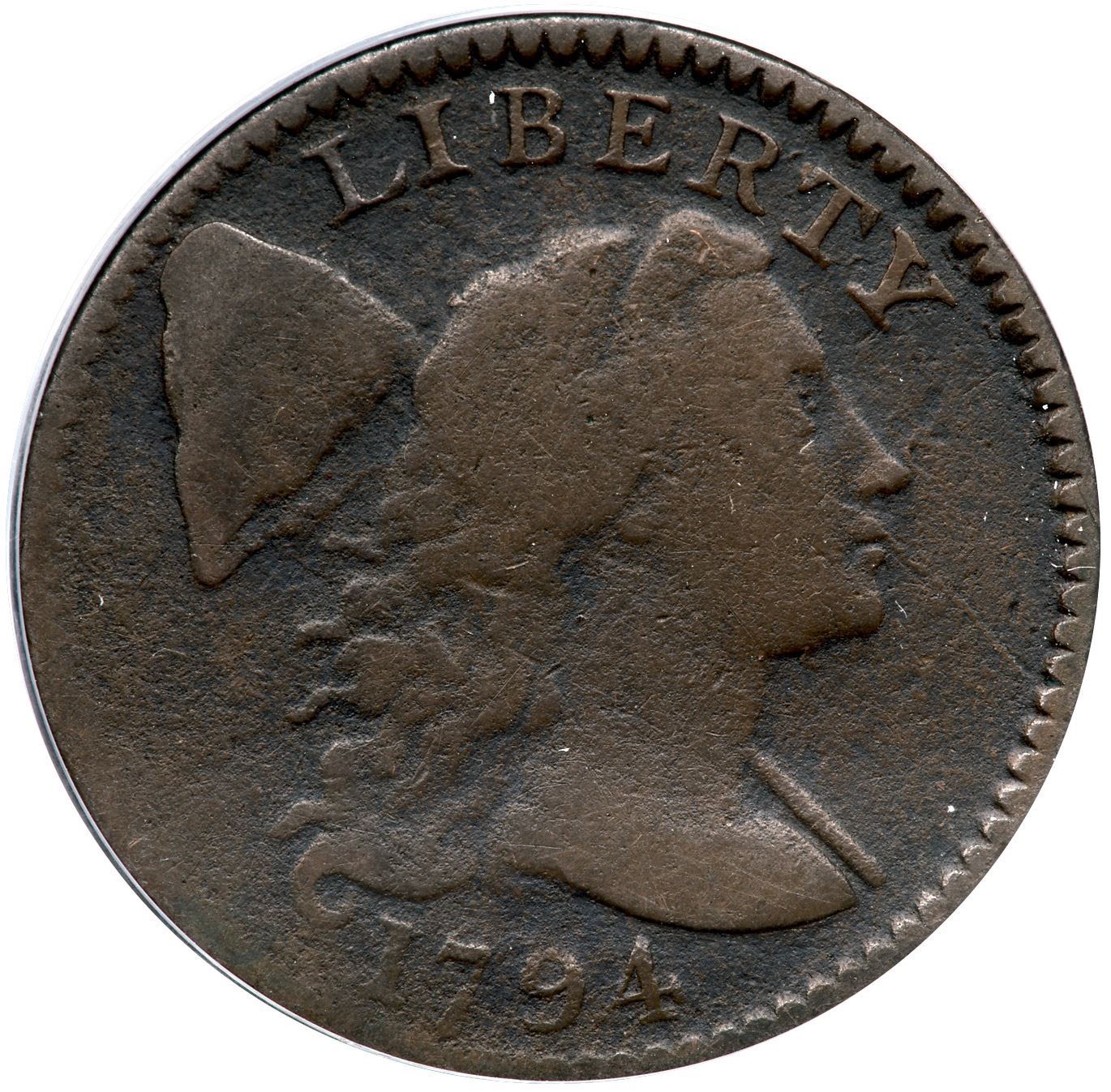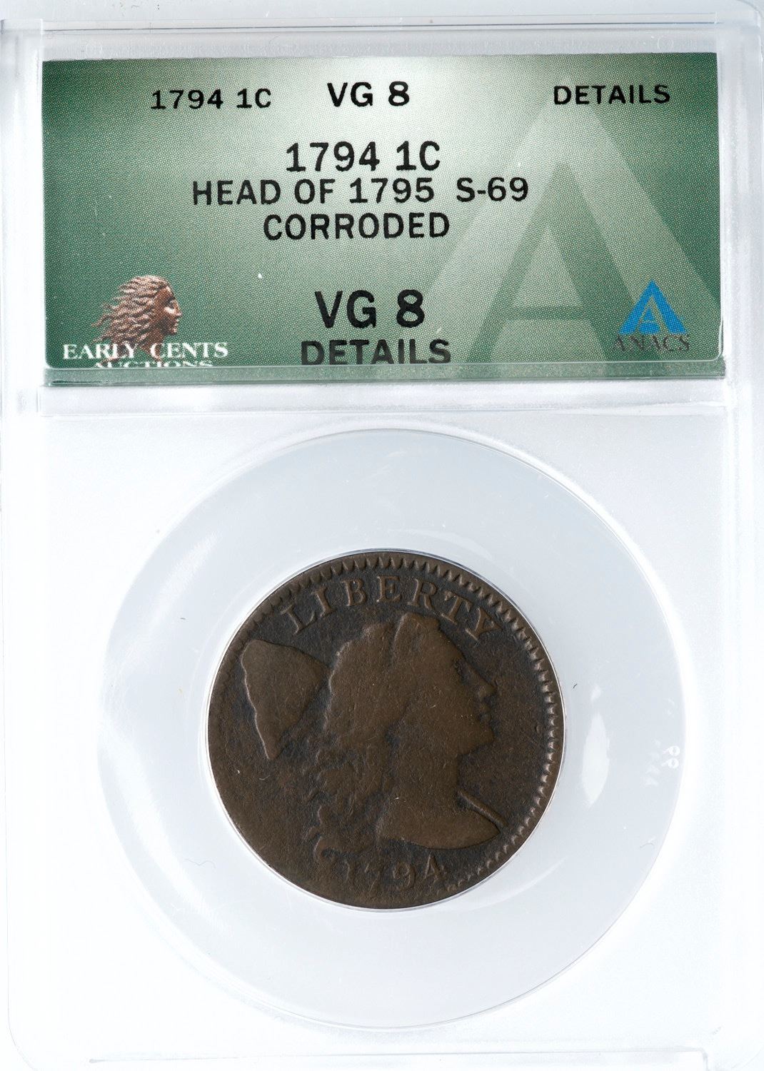 1794 S-69 R-3 ANACS VG8 Details (Corroded)VG sharpness but fine granularity covers the surfaces, the reverse slightly more rough than the obverse. STATES OF and ONE CENT are obscured but the remaining legends are readable and date is clear. Golden brown and deep olive patina. Our grade is AG3.Certificate Number: Certificate Number# 7686492