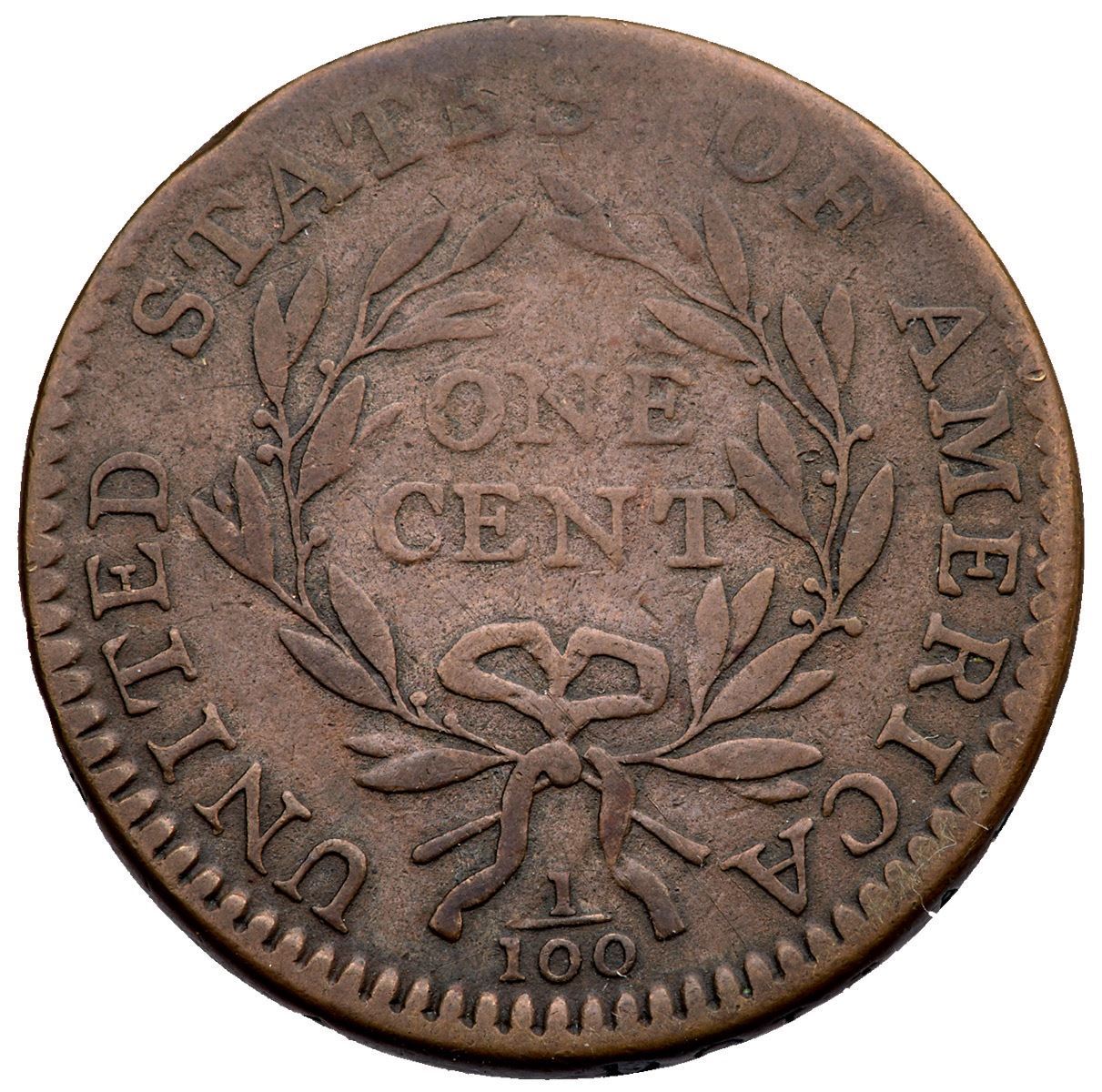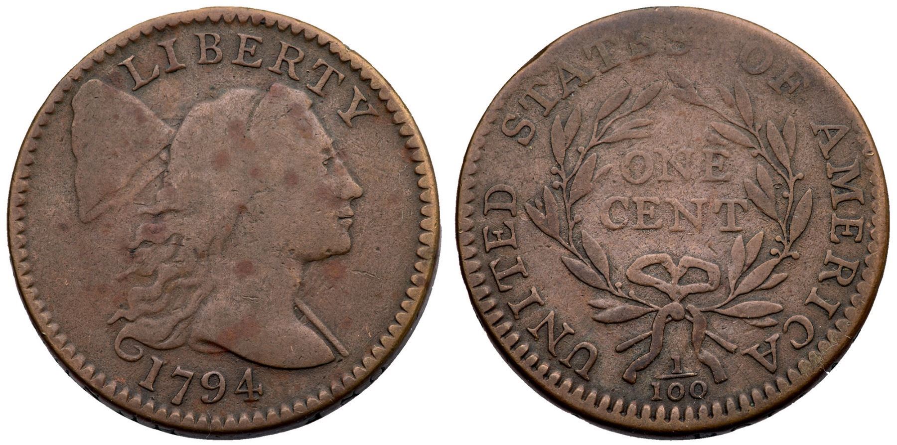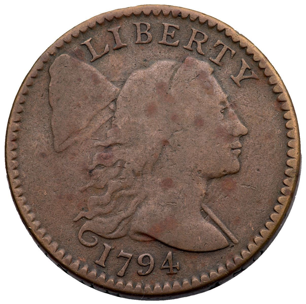 1794 S-71 R-2 VG10Tan and medium olive browns with scattered ruddy brown spots on the obverse. The only mark is a rim bruise at TA in STATES. Choice, smooth surfaces, with a bold date and full legends. EDS.Certificate Number: Pedigree: Ex; Unknown source EAC 1992 - William Schwartz