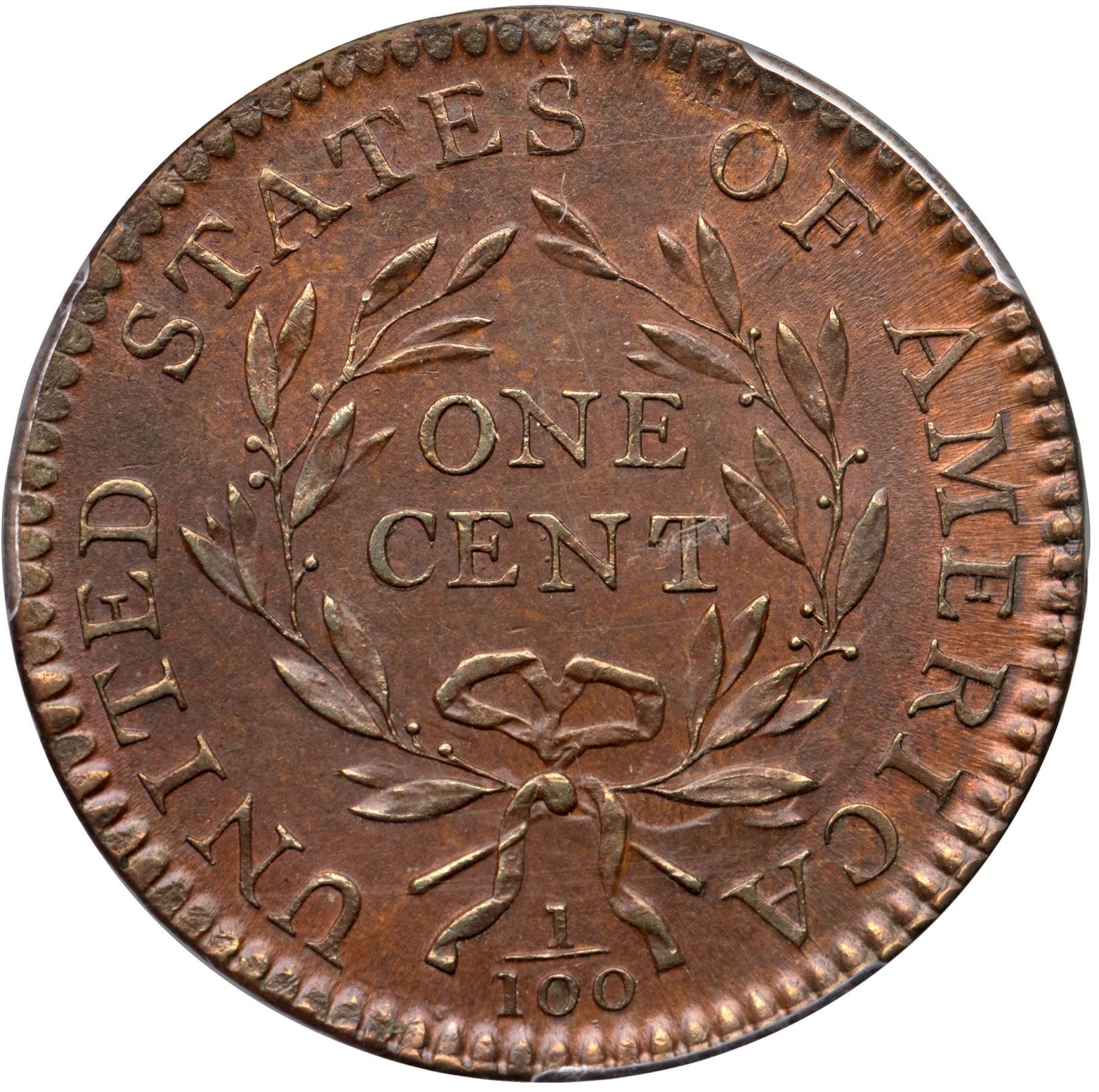Lustrous medium steel brown and light chocolate with generous traces of faded mint red remaining, especially on the obverse. No spots, stains, or roughness. The only marks are some barely visible planchet chips around the date and lowest curl plus a microscopic planchet flake over the left foot of the E in AMERICA. The surfaces are lustrous and the eye appeal is excellent, but there is a hint of rub on the very highest points of the hair (what we used to call "cabinet friction"). It's obvious this cent never circulated. MDS, Breen state IV, showing clear die clashmarks from AME before the face in addition to other sharp clashmarks around the portrait. Graded AU55 Choice and tied for CC#3 in the Noyes census, his photo #22674. Bland says AU55 and tied for CC#3. Our grade is AU58+, very close to MS60. This cent has solid mint state eye appeal. The attribution and Oswald-Reynolds provenance are noted on the PCGS Secure label.