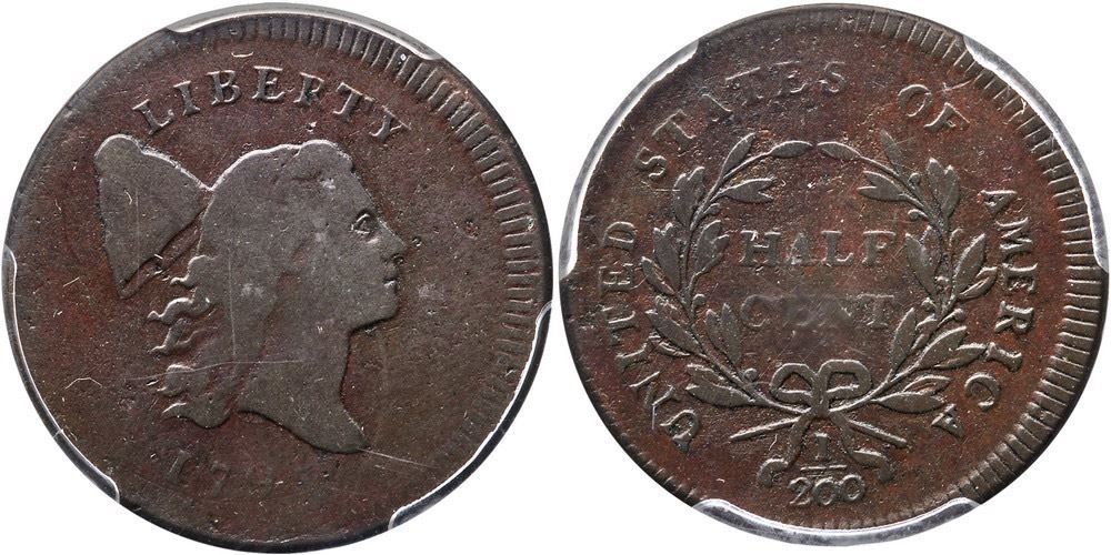 Glossy dark reddish chocolate brown with slightly lighter toning on the devices. The surfaces are smooth and void of marks except for a small, shallow pit near the dentils before the face. Struck on a think planchet cut-down from a large cent planchet. Unfortunately PCGS did not include the exact weight on the label, but the abnormal thickness is obvious. The date is a bit weakly struck, as usual for these think planchet strikes, especially on the 5, but it is still easily readable. The legends are clear. Our grade is VG10. The attribution is noted on the PCGS label. (The slab is scuffed on the reverse.)